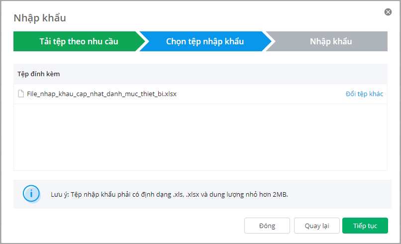 • Nhập khẩu mới/Tải tệp mẫu đầy đủ: Nhập khẩu đầy đủ các thông tin như: Mã thiết bị, Tên thiết bị, Loại thiết bị, Đơn vị tính,…