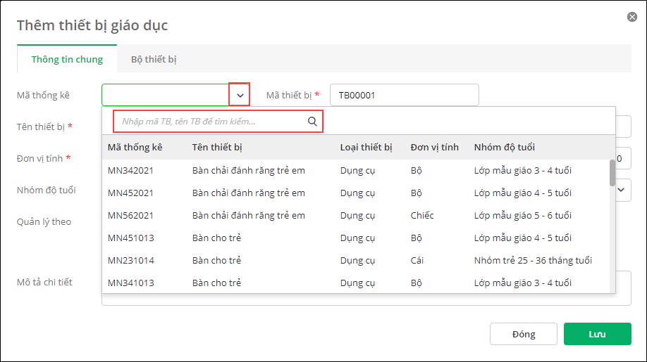 •  Mã thống kê: Là mã theo danh mục thiết bị dạy học tối thiểu của Bộ GD&ĐT/Sở GD&ĐT/Phòng GD&ĐT nếu trường có nhu cầu sử dụng mã thiết bị theo đơn vị chủ quản. Anh/chị tìm kiếm nhanh theo Tên thiết bị, Mã thống kê. Chọn thiết bị theo kết quả gợi ý. Phần mềm tự động lấy lên thông tin thiết bị đó theo Danh mục thiết bị tối thiểu theo quy định.