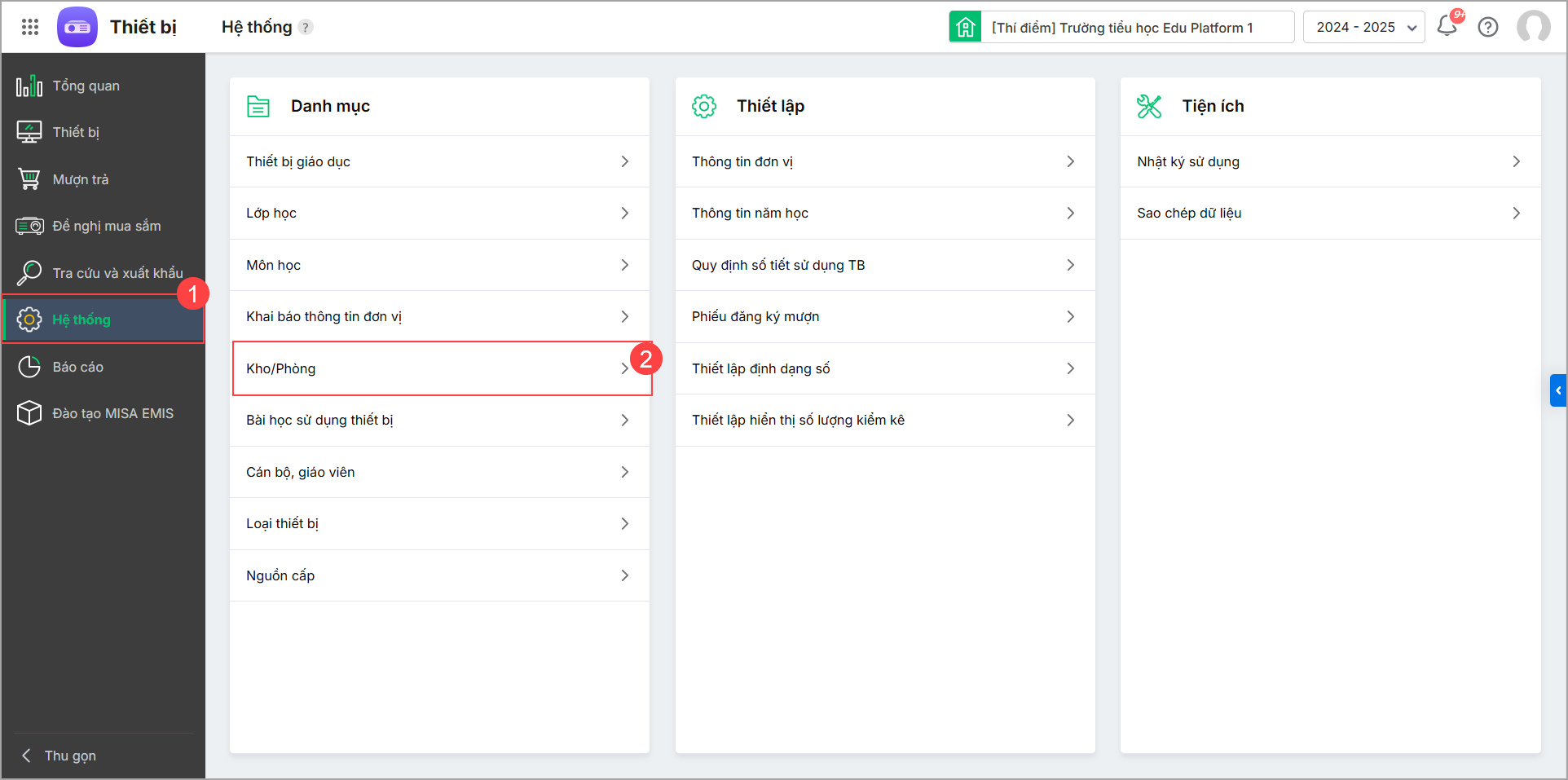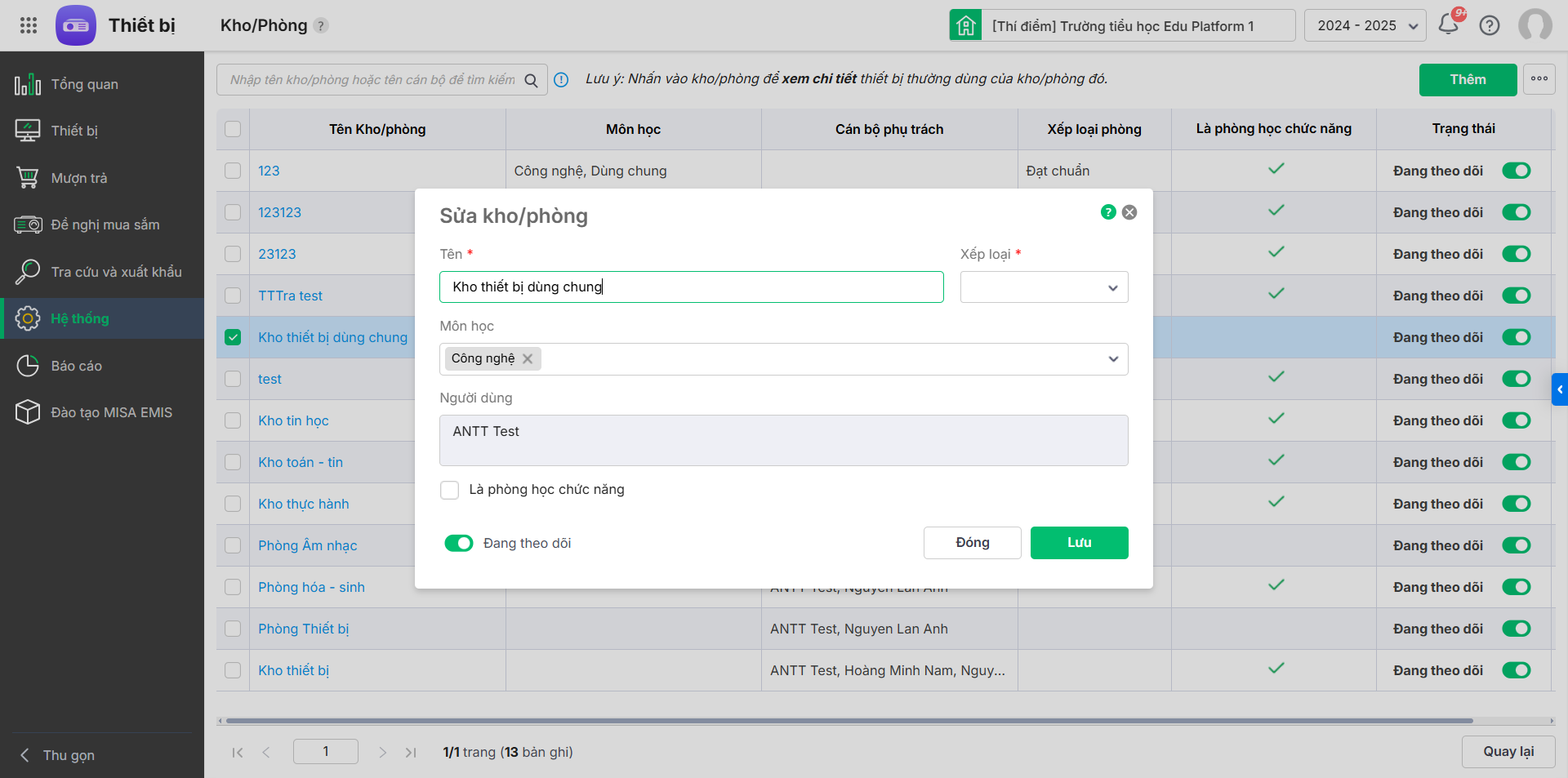 - Khai báo thông tin về kho/phòng học bộ môn.