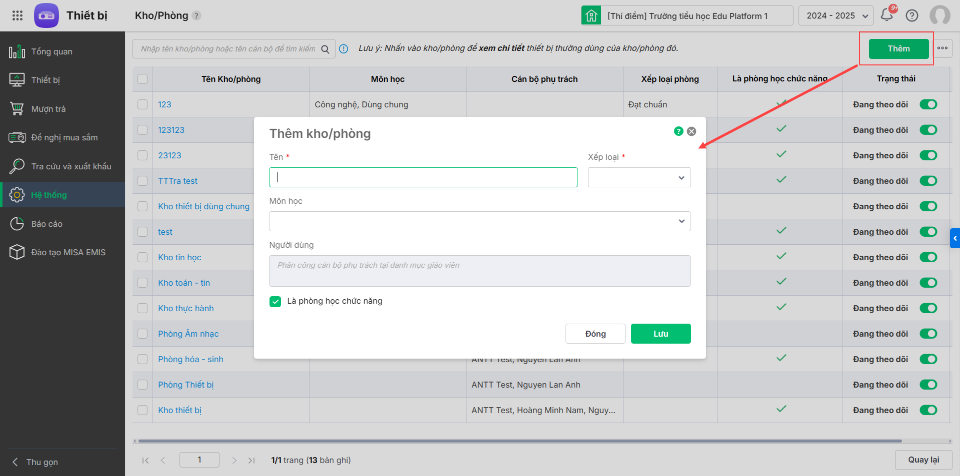 Tích chọn Là phòng học chức năng nếu phòng thêm mới là phòng học chức năng. - Nhấn Lưu
