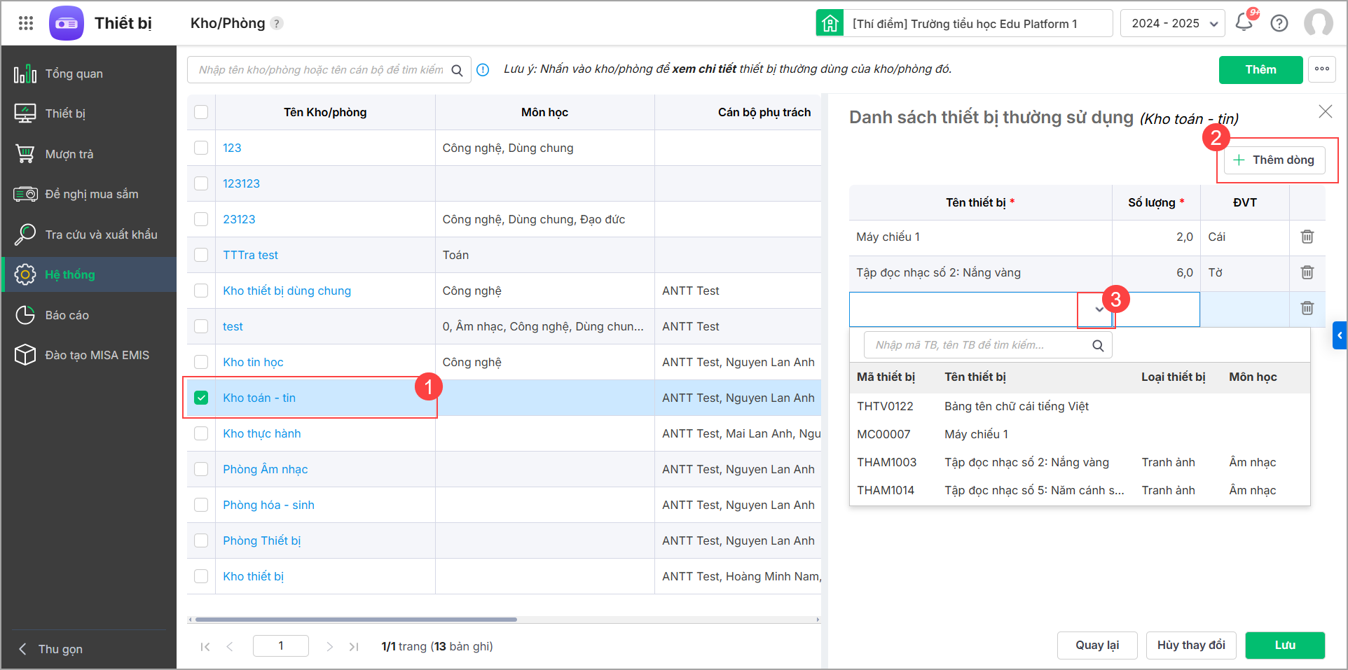 - Nhấn Thêm dòng và thêm các thiết bị thường sử dụng tương ứng với kho phòng từ danh sách thiết bị