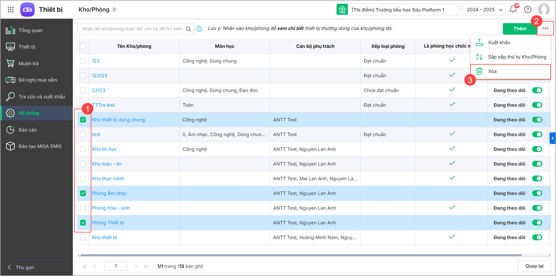 - Trường hợp muốn xóa nhiều danh mục kho/phòng, anh/chị thực hiện như sau: