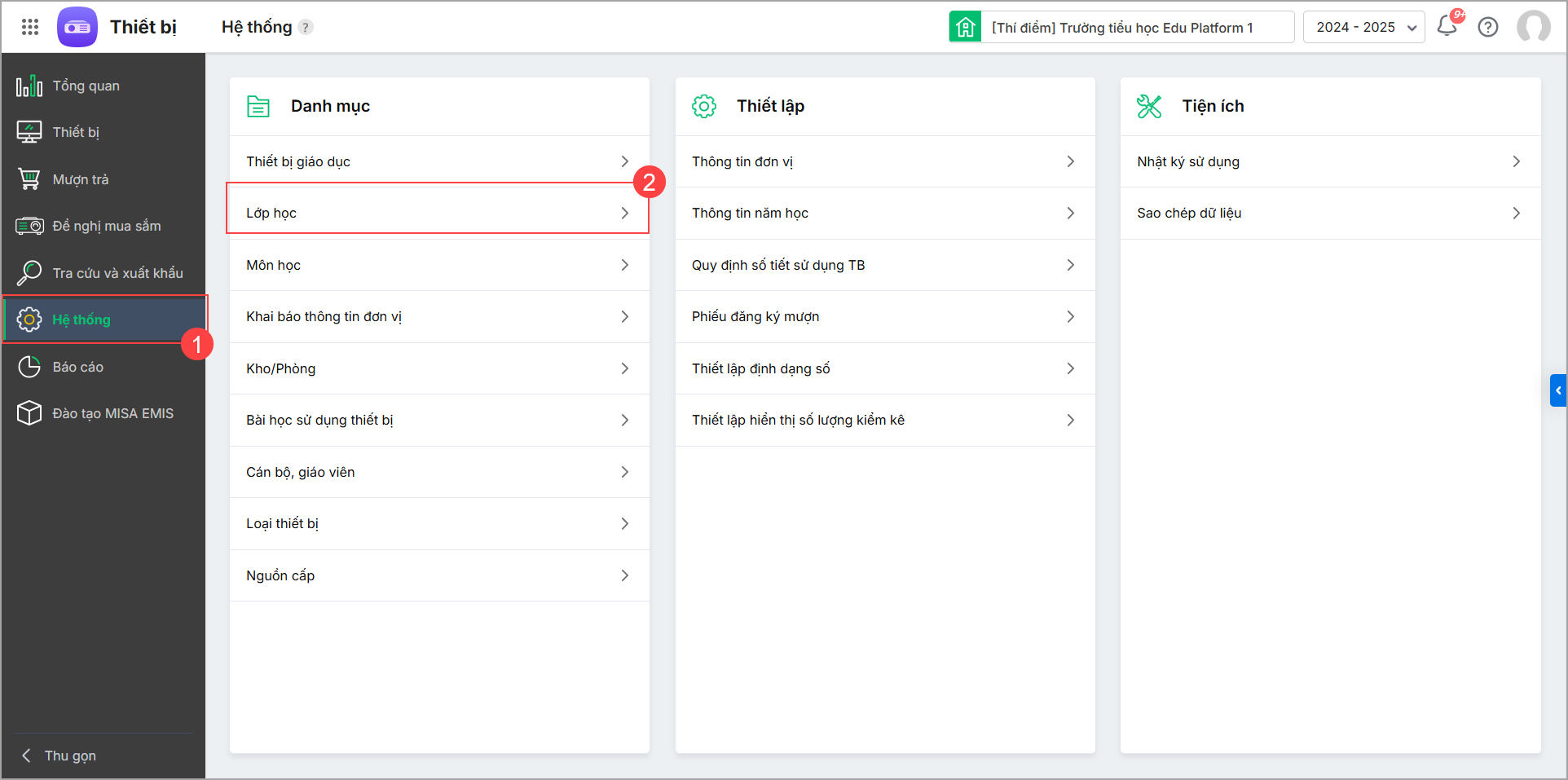 Khai báo lớp học, phòng bộ môn để quản lý việc đăng ký trả mượn thiết bị, phòng bộ môn. Có thể thực hiện khai báo toàn bộ lớp trong trường hoặc khai báo từng lớp học một.
