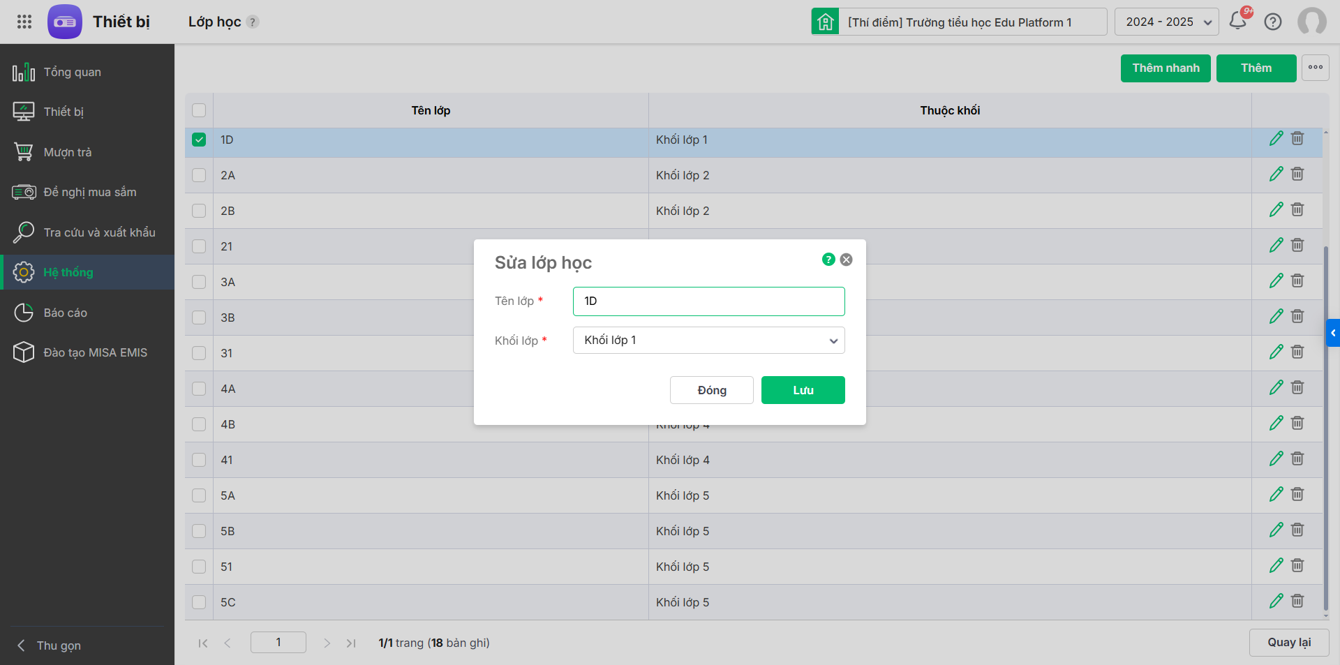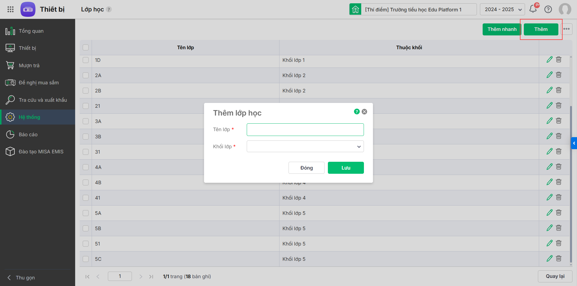- Nhấn Thêm nhanh để khai báo nhanh toàn bộ các lớp thuộc trường học