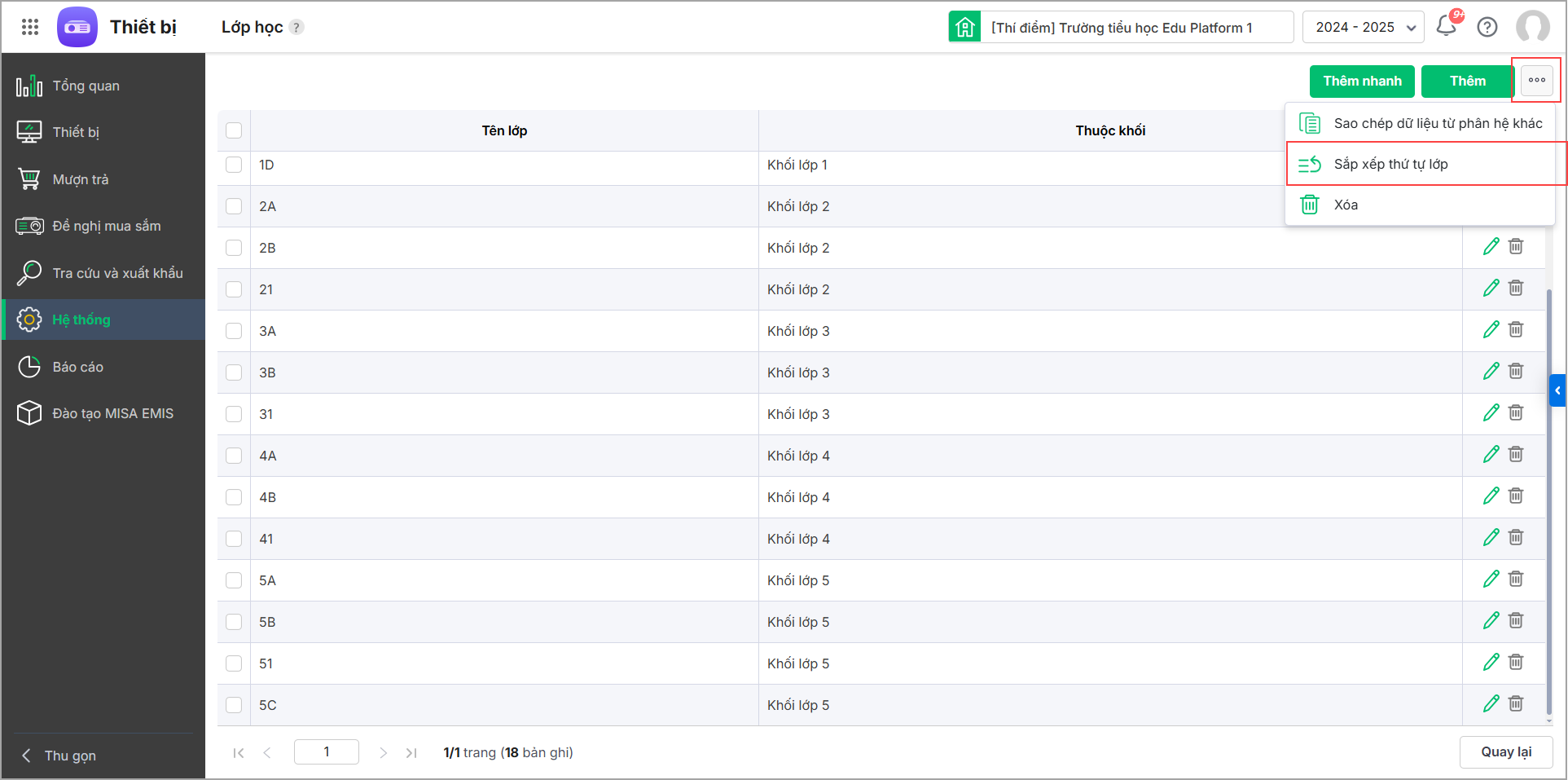 - Nhấn vào biểu tượng “tiện ích”, chọn Sắp xếp thứ tự lớp