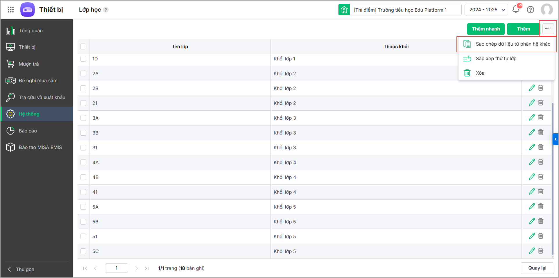 Trường hợp đơn vị sử dụng cùng lúc nhiều phân hệ , anh/chị có thể sao chép danh sách lớp học từ phân hệ khác sang.