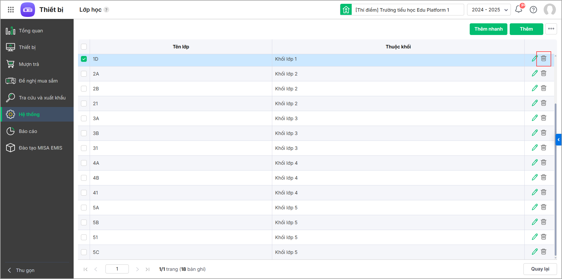 - Nhấn biểu tượng “thùng rác” tại lớp học muốn xóa để xóa từng lớp học.