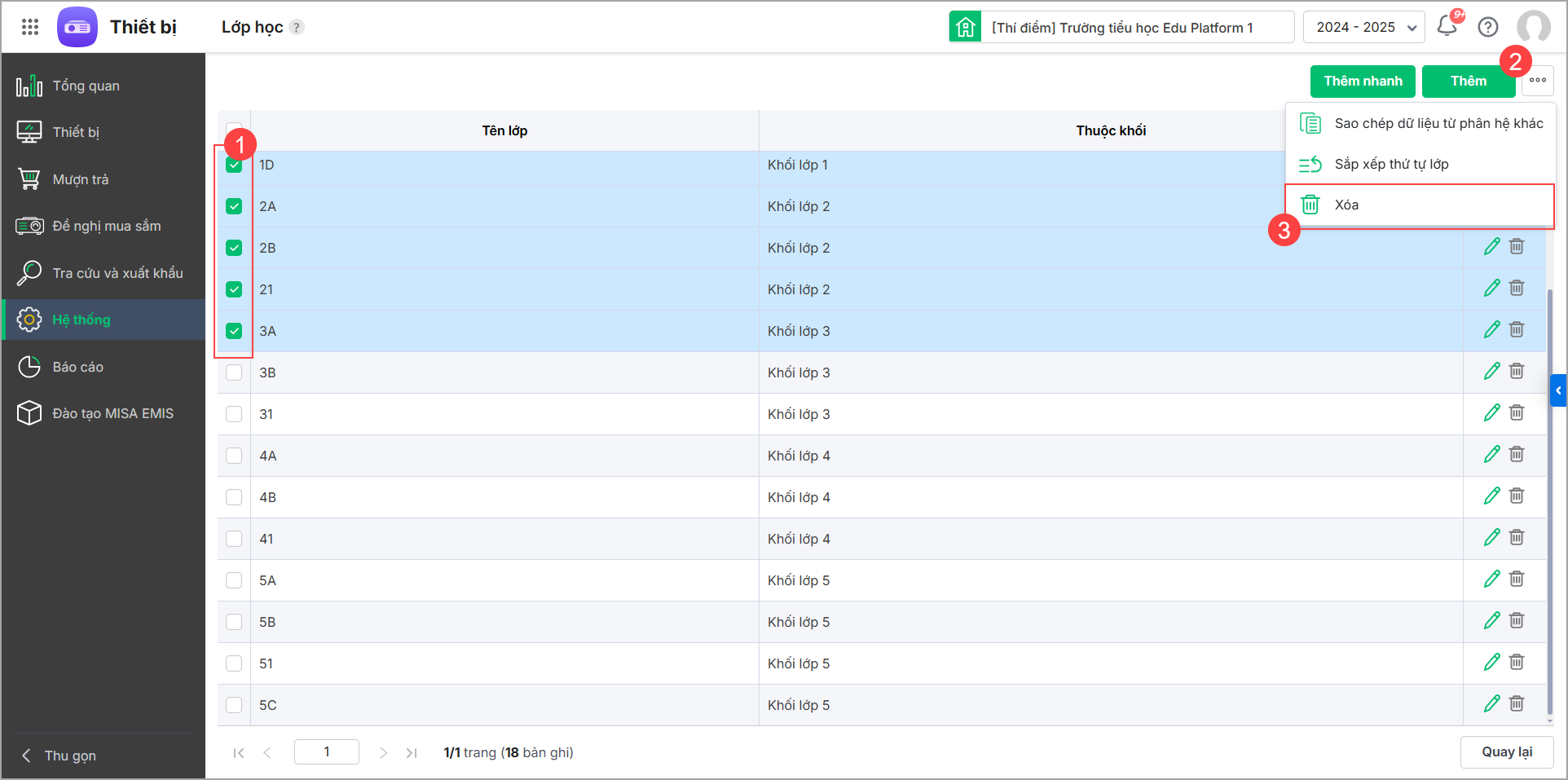 - Trường hợp muốn xóa nhiều danh mục lớp học, anh/chị thực hiện như sau: