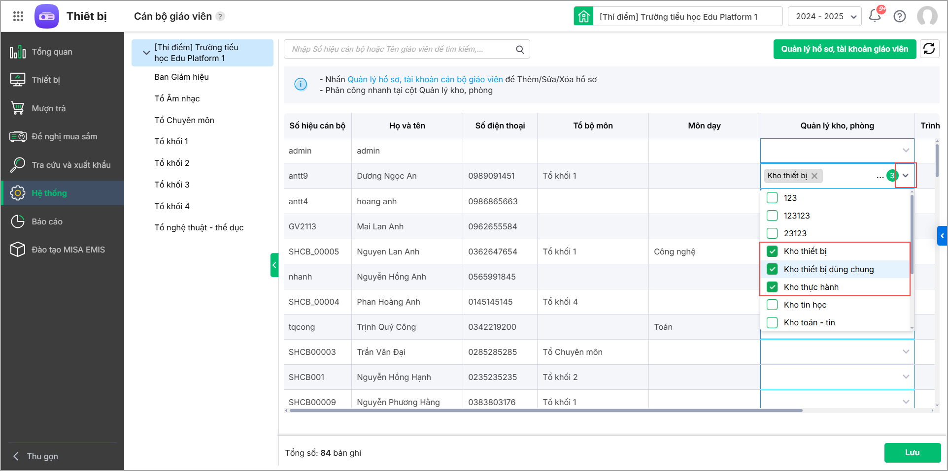 • Anh/chị có thể phân công nhanh cho tài khoản giáo viên quản lý kho phòng bằng cách chọn biểu tượng mũi tên tại cột Quản lý kho, phòng.