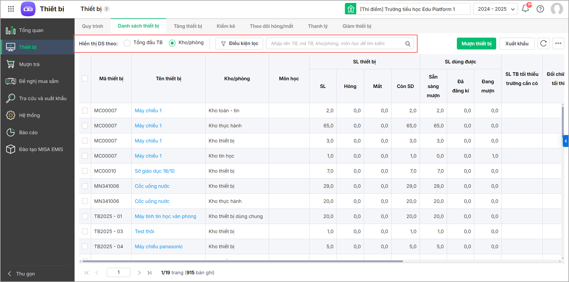 - Vào Thiết bị\Danh sách thiết bị. Tùy theo nhu cầu đơn vị, anh/chị có thể chọn xem theo Tổng đầu TB hoặc danh sách thiết bị theo kho/phòng.