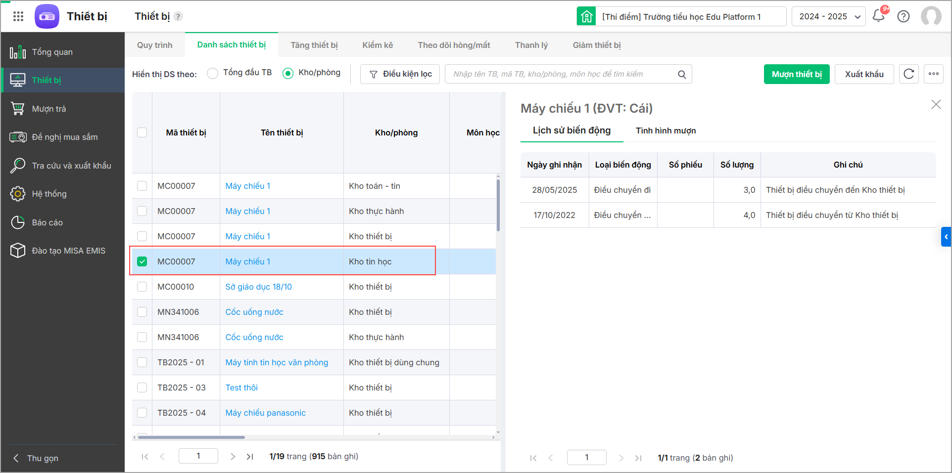 - Tích chọn vào thiết bị để theo dõi lịch sử biến động cũng như tình hình mượn của thiết bị đó.