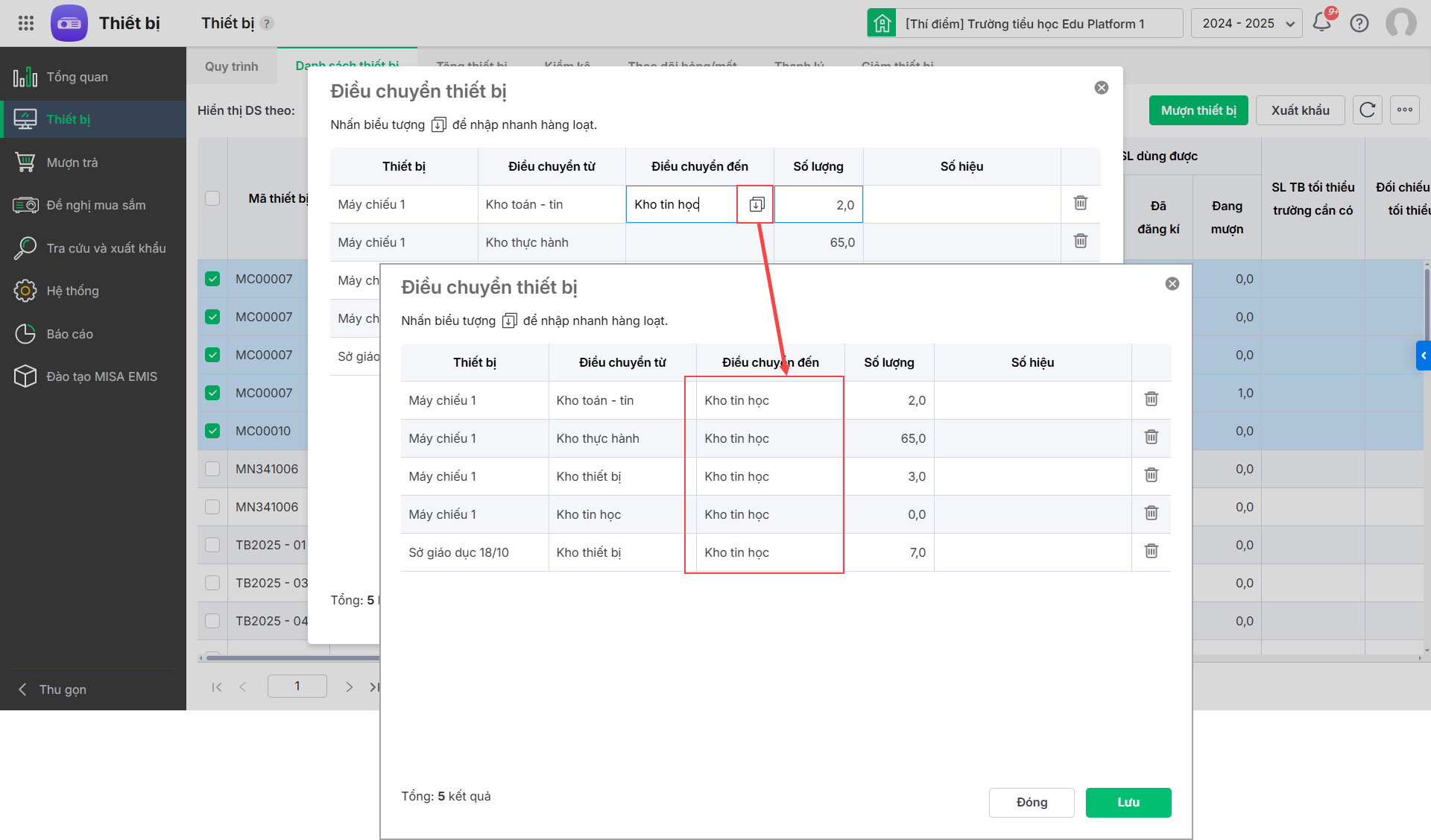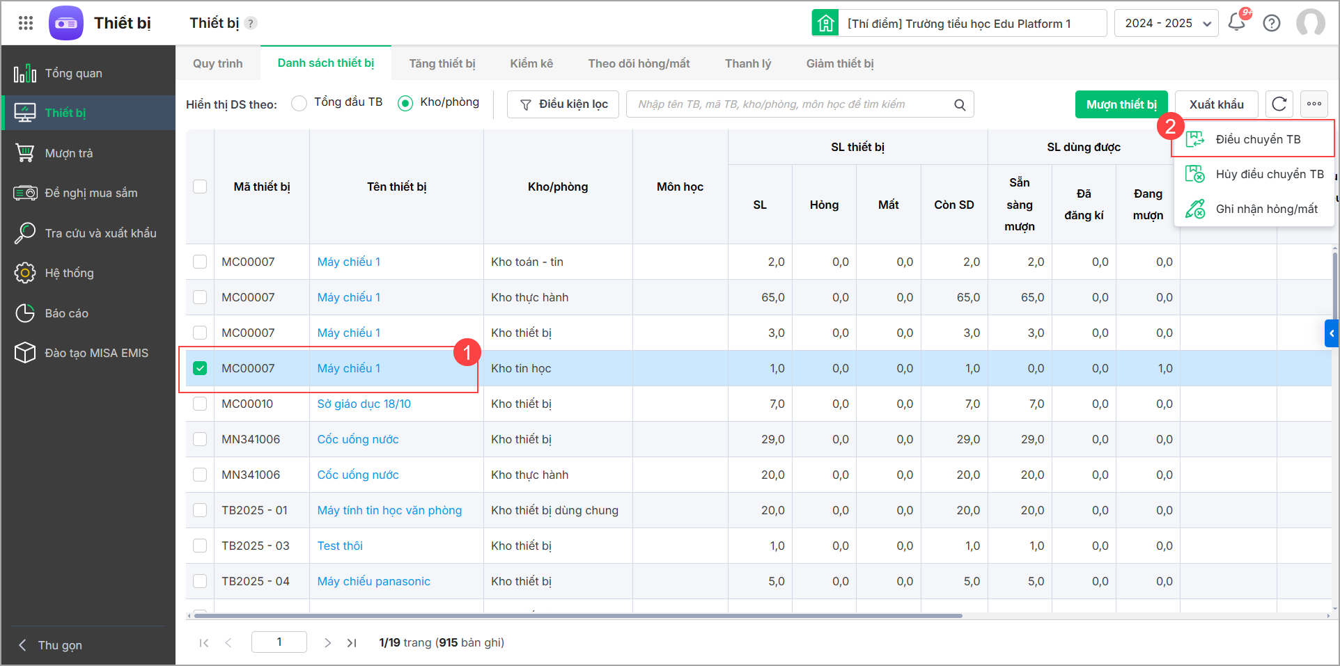 - Chọn kho/phòng cần điều chuyển thiết bị đến.