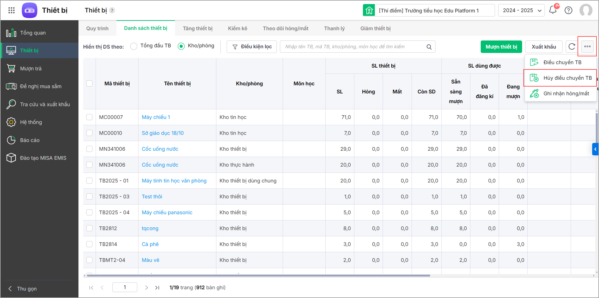 - Nhấn vào dấu ba chấm, chọn Hủy điều chuyển TB.