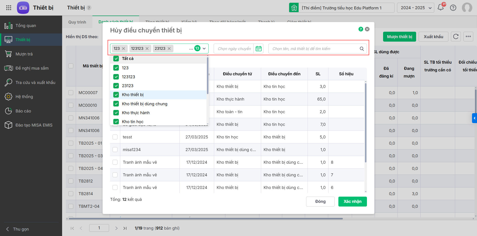 - Lọc nhanh danh sách thiết bị cần hủy điều chuyển theo kho/phòng; ngày điều chuyển hoặc tìm kiếm trên thanh tìm kiếm.