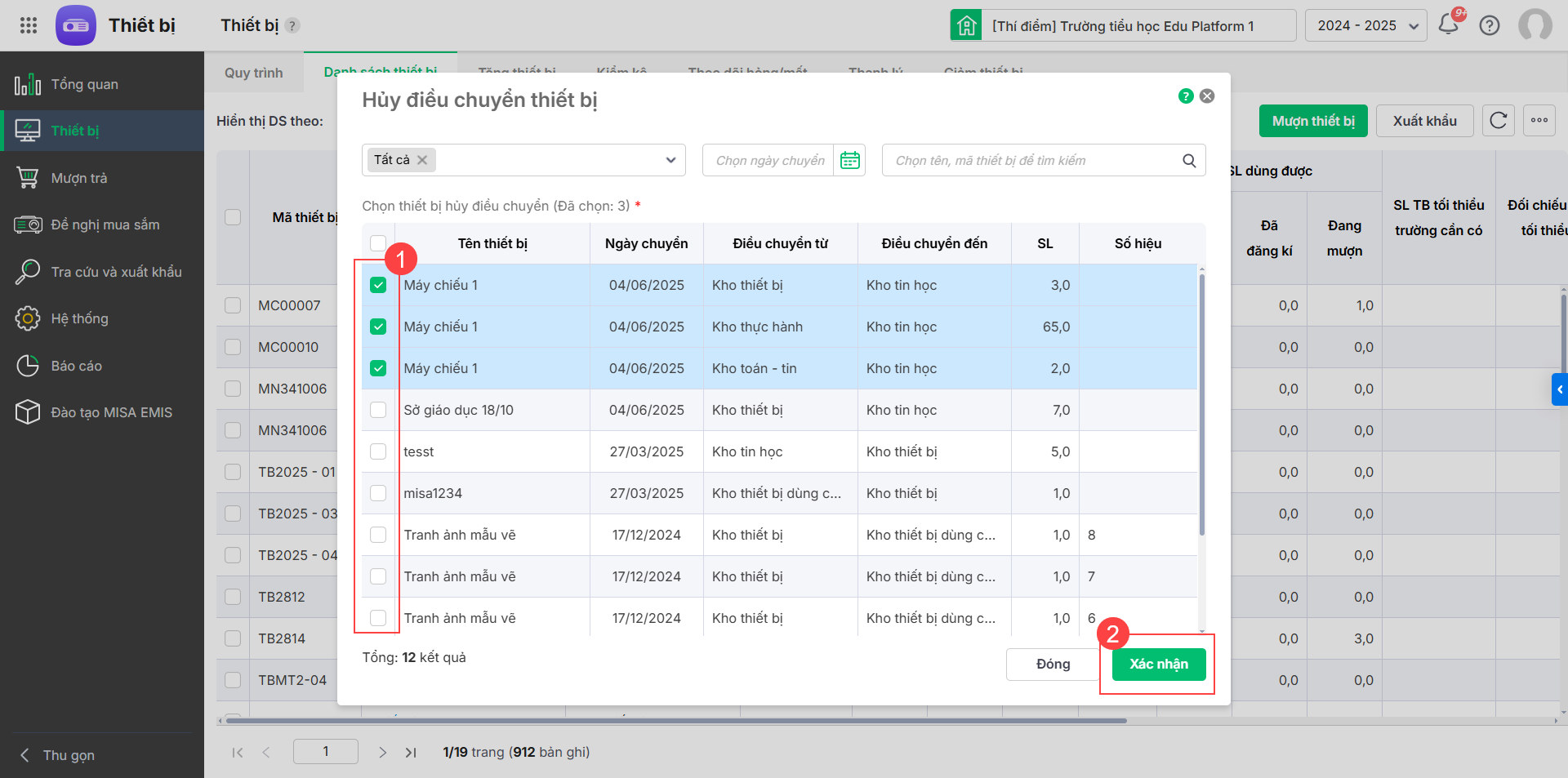 - Tích chọn thiết bị và nhấn Xác nhận để hủy điều chuyển thiết bị.