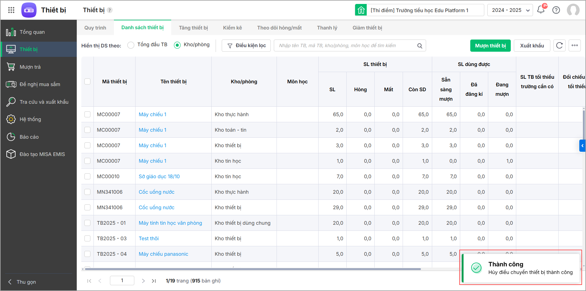 - Nhấn Lưu để hoàn tất điều chuyển thiết bị sang kho/phòng mới.