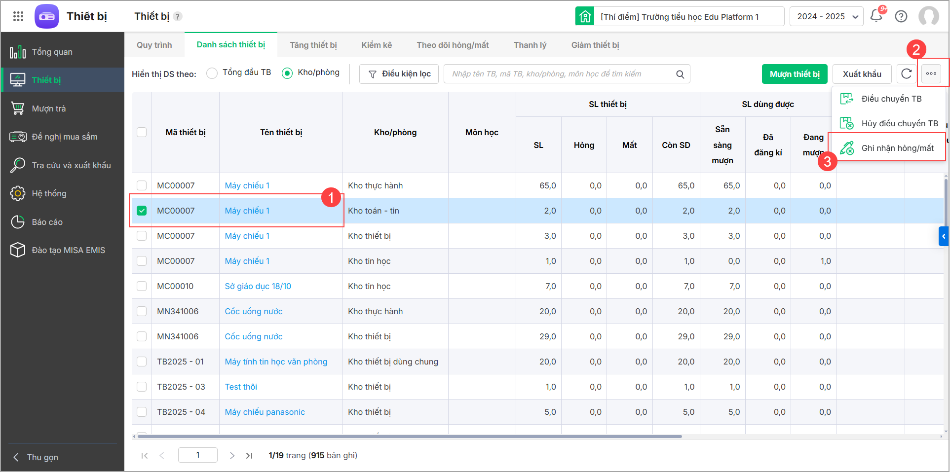 - Tích chọn từng thiết bị cần ghi nhận, nhấn vào dấu ba chấm và chọn Ghi nhận hỏng/ mất.