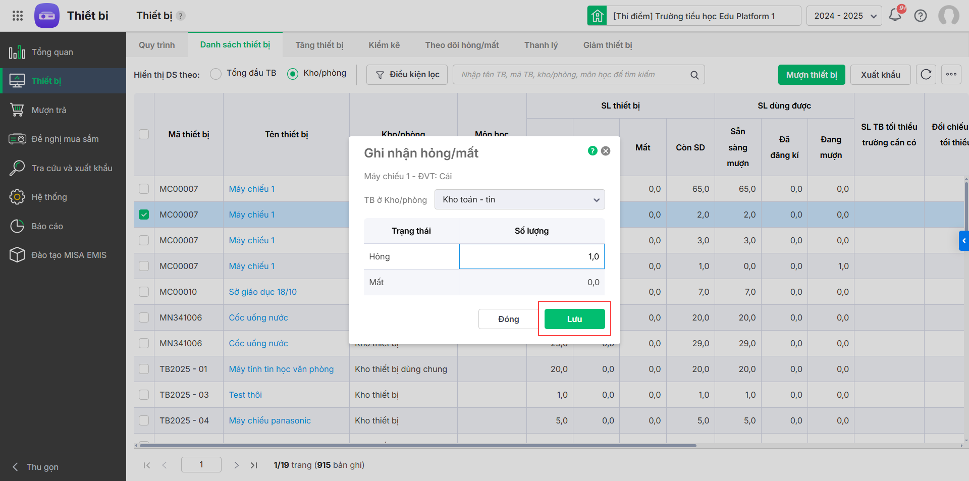 - Khai báo thông tin thiết bị hỏng/mất: Kho/phòng, Số lượng hỏng, Số lượng mất. Nhấn Lưu để ghi nhận.