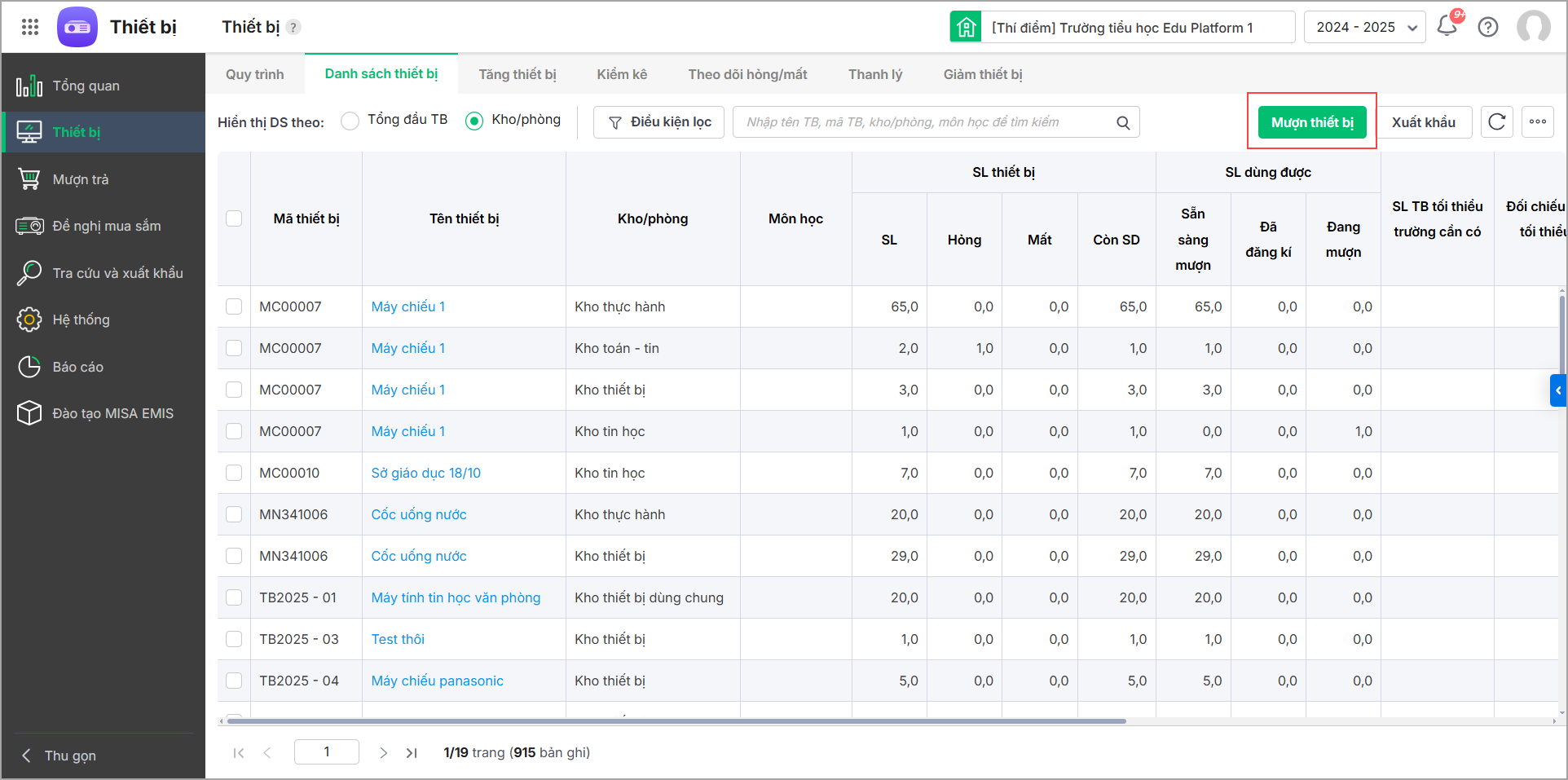 Trường hợp đơn vị sắp xếp lại thiết bị ở các kho/phòng, cán bộ thiết bị dễ dàng điều chuyển thiết bị từ kho phòng này sang kho phòng khác trên phần mềm.