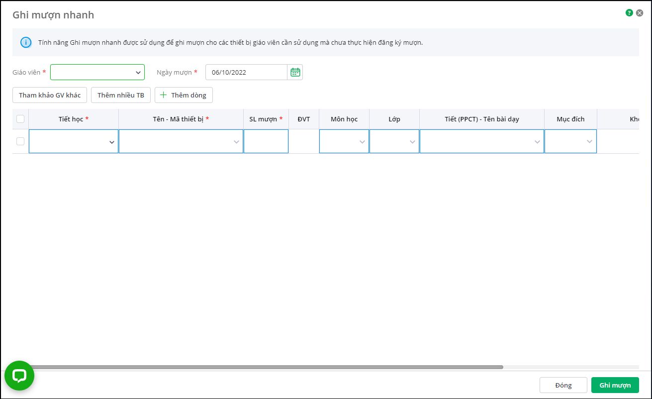 Trường hợp cần ghi mượn các thiết bị mà giáo viên chưa đăng ký mượn trước đó, anh/chị có thể thực hiện Ghi mượn nhanh như sau: