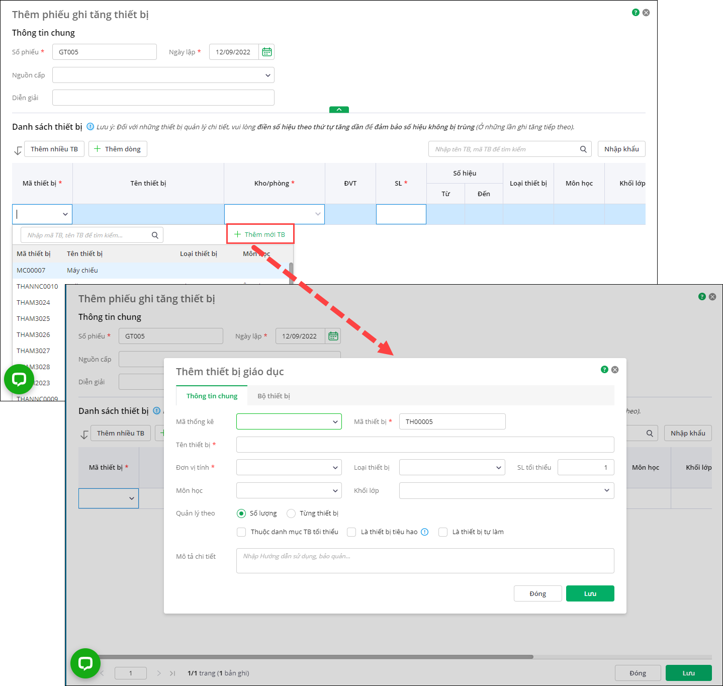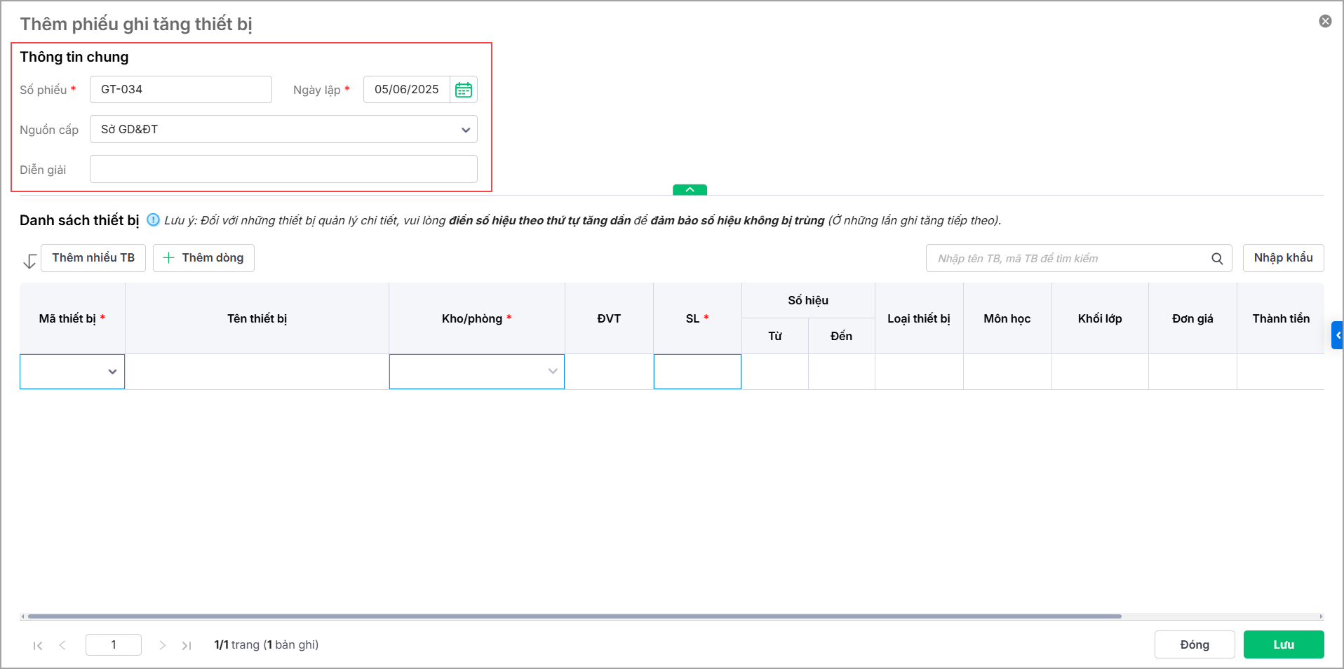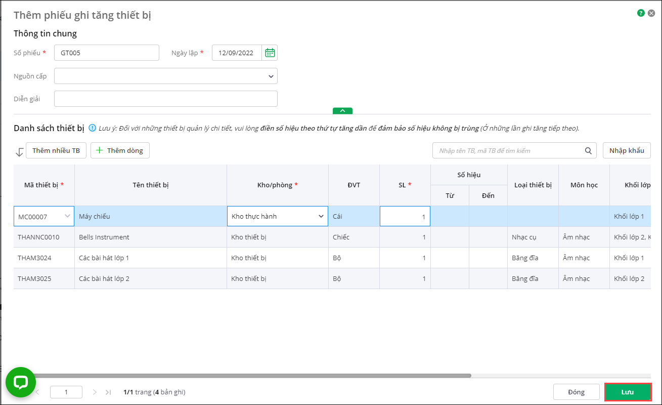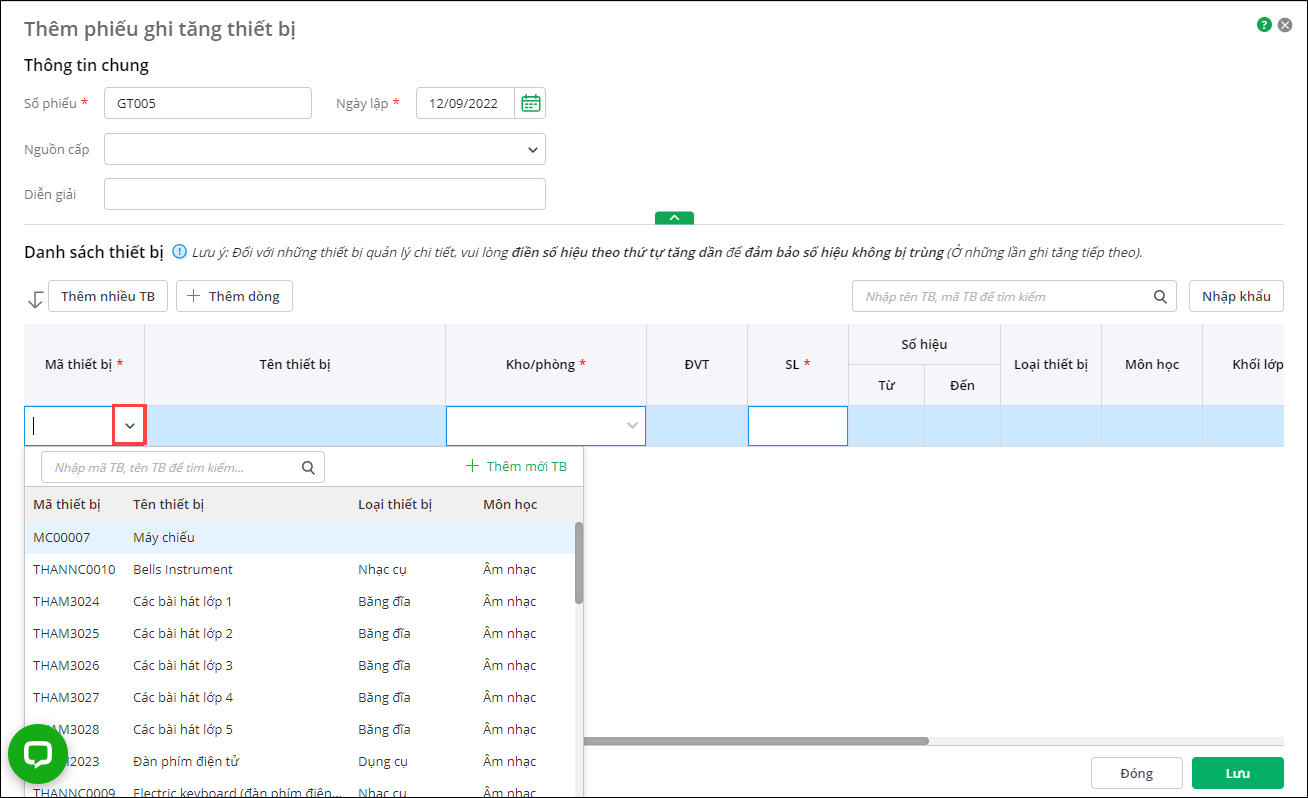 - Nhấn Thêm để thêm phiếu ghi tăng thiết bị.