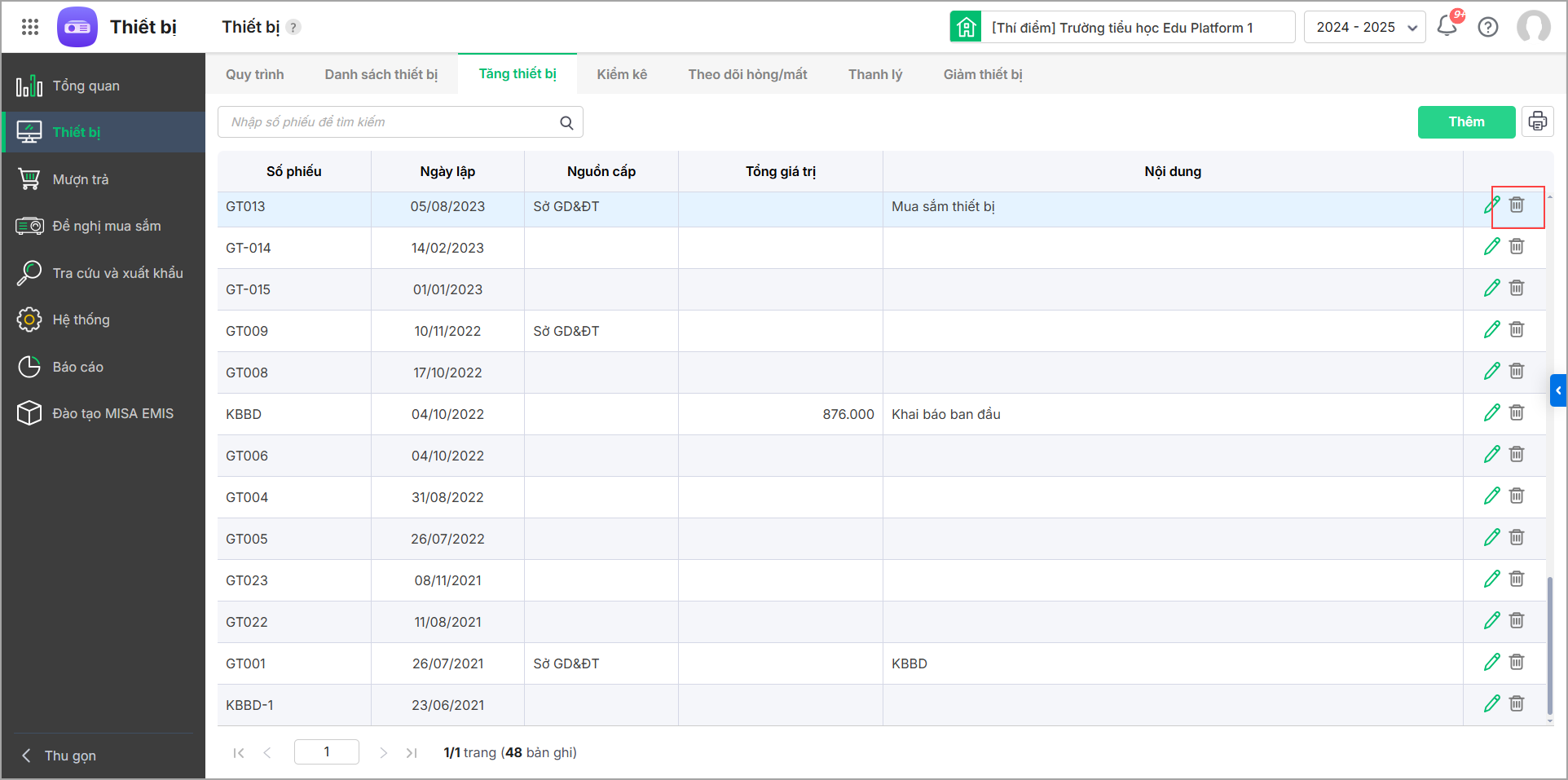 - Nhấn biểu tượng “thùng rác” tại phiếu ghi tăng thiết bị muốn xóa để xóa từng phiếu ghi tăng thiết bị.
