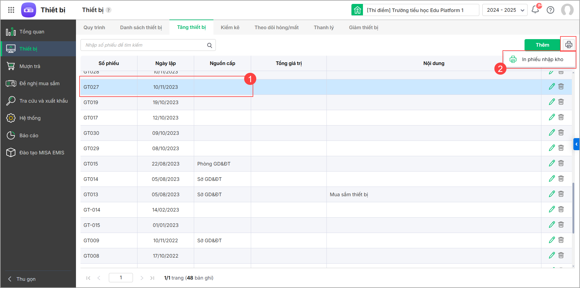 - Chọn phiếu tăng thiết bị và nhấn vào biểu tượng máy in, chọn In phiếu nhập kho.