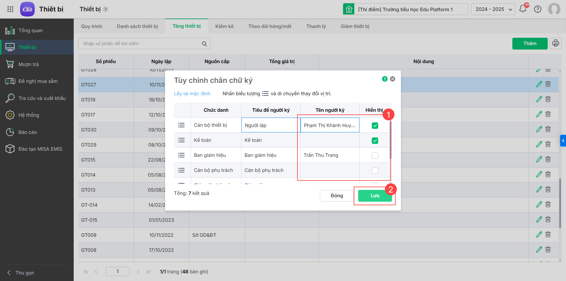 - Tích chọn thông tin chân chữ ký hiển thị trên phiếu in. Danh sách cán bộ giáo viên được lấy từ mục Thiết lập thông tin đơn vị. Nhấn Lưu.
