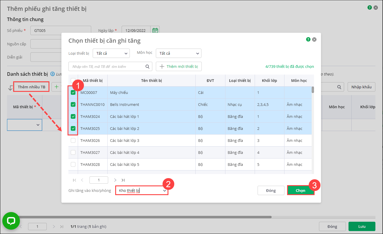 - Nhấn Chọn để thêm thiết bị vào phiếu ghi tăng.