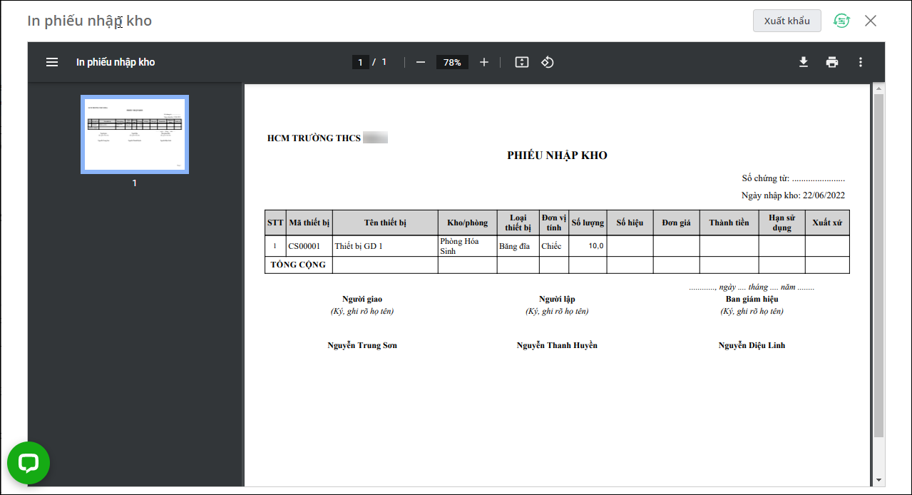 - Anh/chị có thể tải hoặc in phiếu nhập kho.