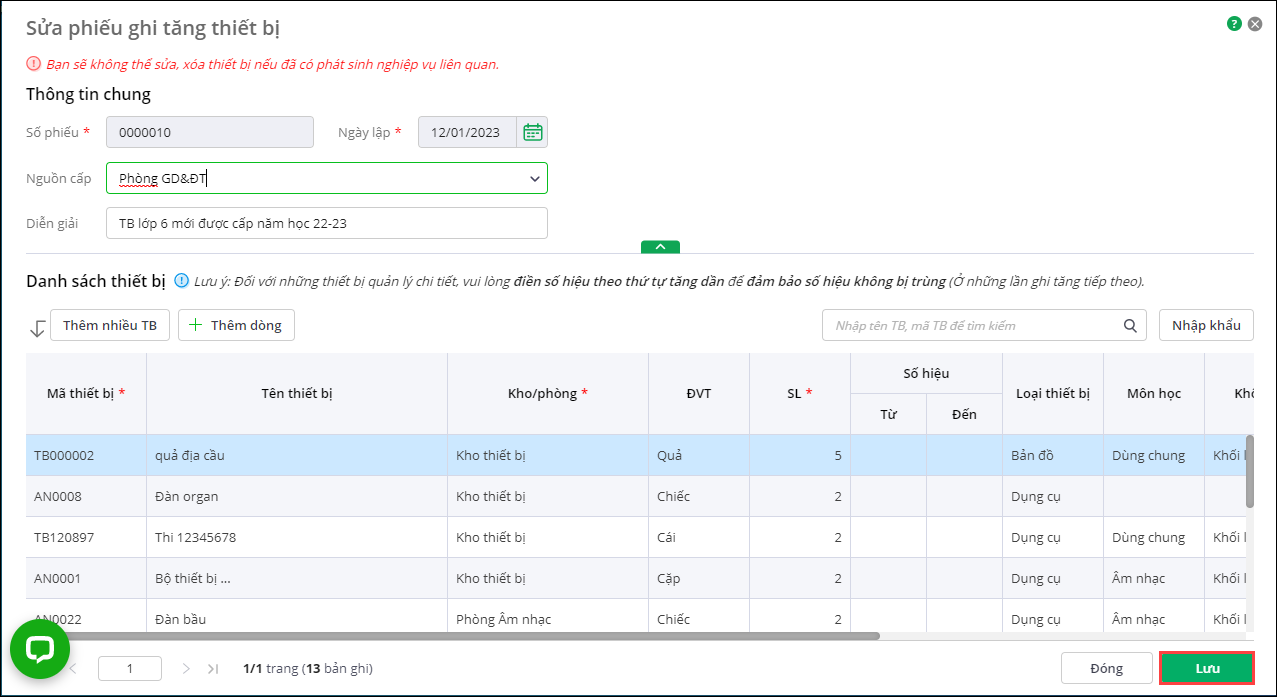 Lưu ý: Trường hợp trong phiếu ghi tăng thiết bị có thiết bị đã phát sinh các nghiệp vụ thì anh/chị không được phép sửa thông tin ghi tăng thiết bị đó.