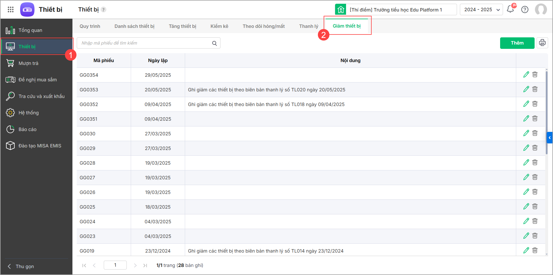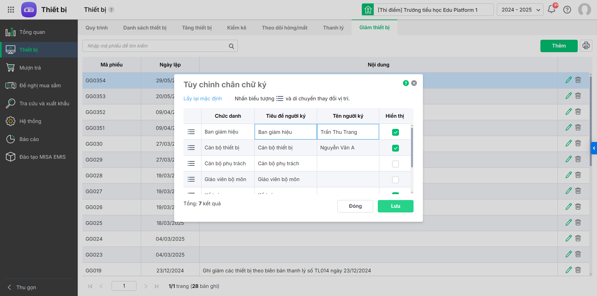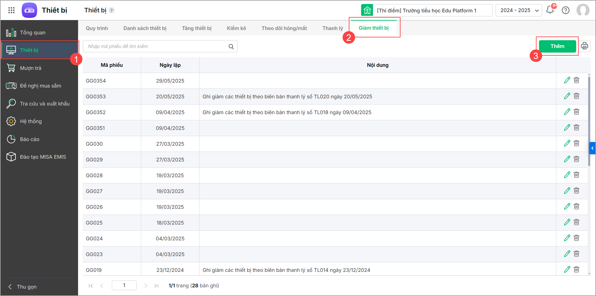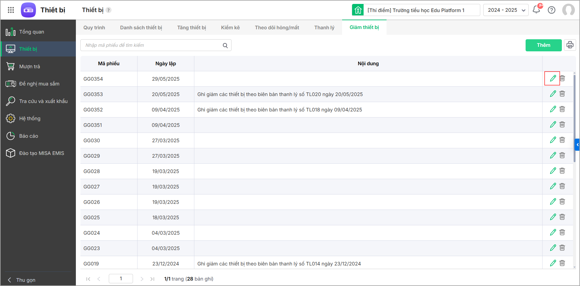 - Sau khi phiếu ghi giảm thiết bị được lưu giữ, hệ thống sẽ tự động cập nhật lại các thông tin số lượng thiết bị, số lượng hỏng, mất và còn dùng được của các thiết bị này trên màn hình Danh sách thiết bị.