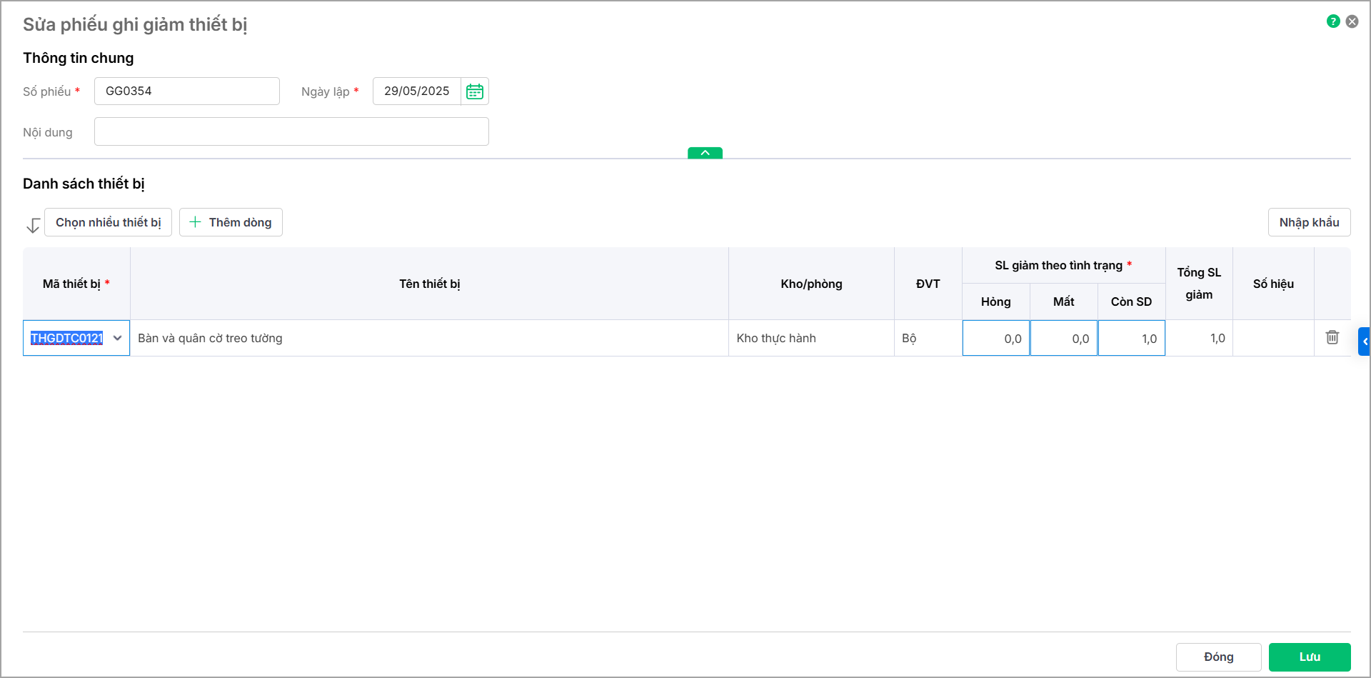 Lưu ý: Trường hợp trong phiếu ghi giảm thiết bị có thiết bị đã phát sinh các nghiệp vụ tăng thiết bị thì anh/chị không được phép sửa thông tin ghi giảm thiết bị đó.