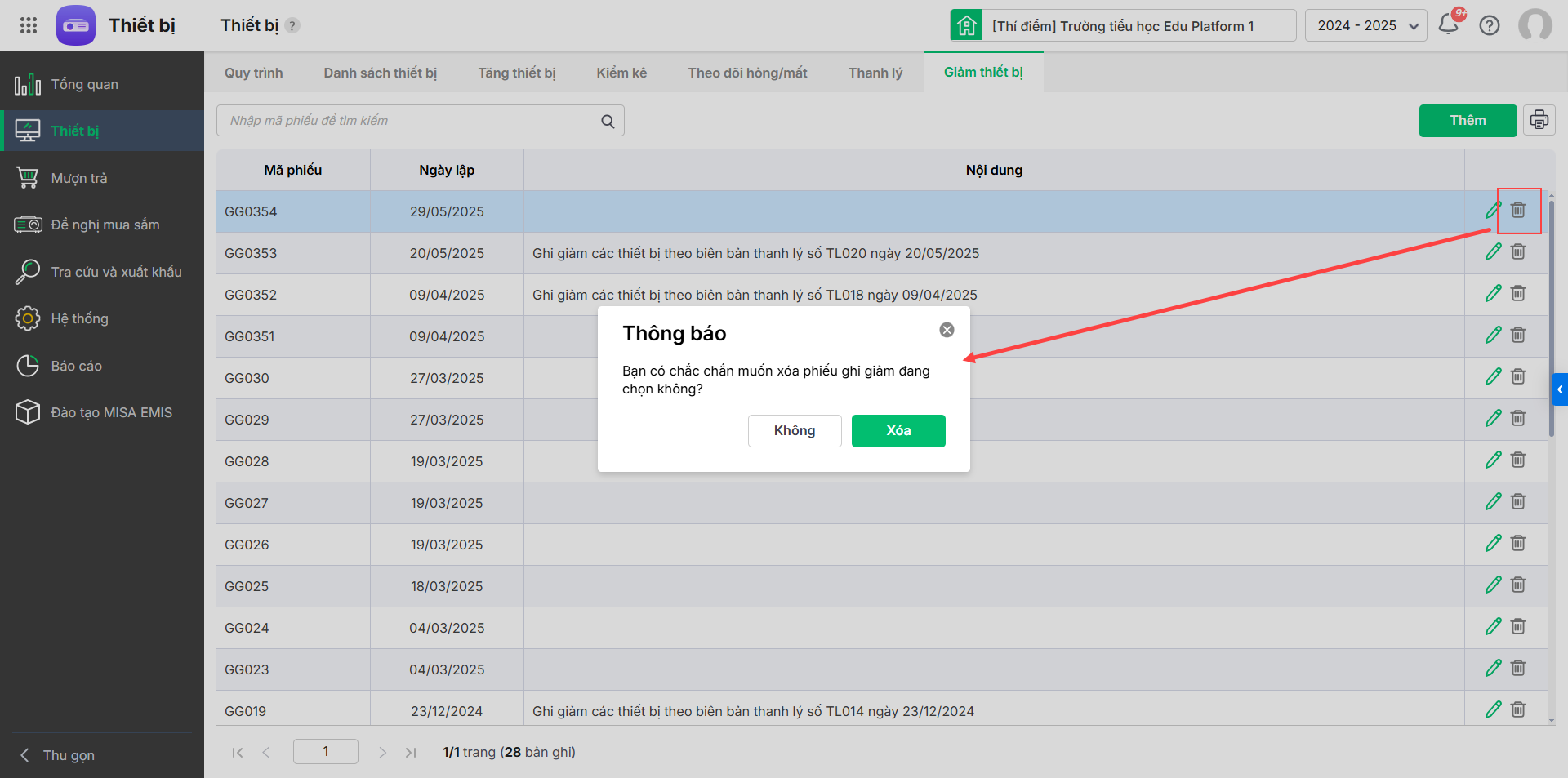 - Nhấn biểu tượng thùng rác tại phiếu muốn xóa và xác nhận Xóa.