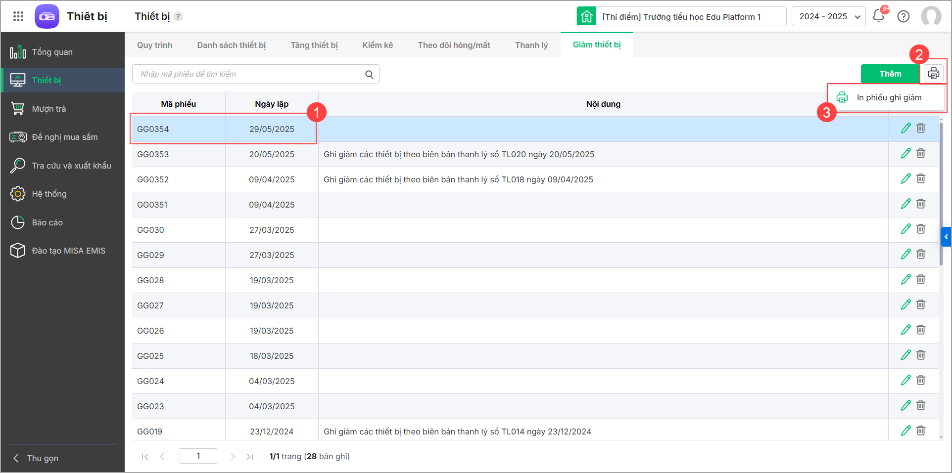 - Để in phiếu ghi giảm thiết bị để phục vụ mục đích báo cáo, anh/chị chọn phiếu ghi giảm rồi nhấn vào máy in, chọn In phiếu ghi giảm.