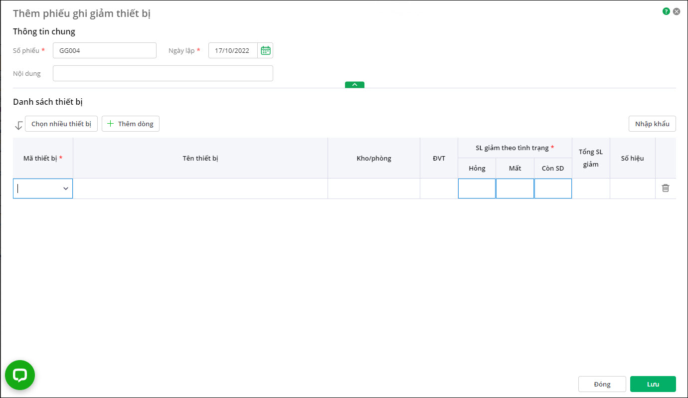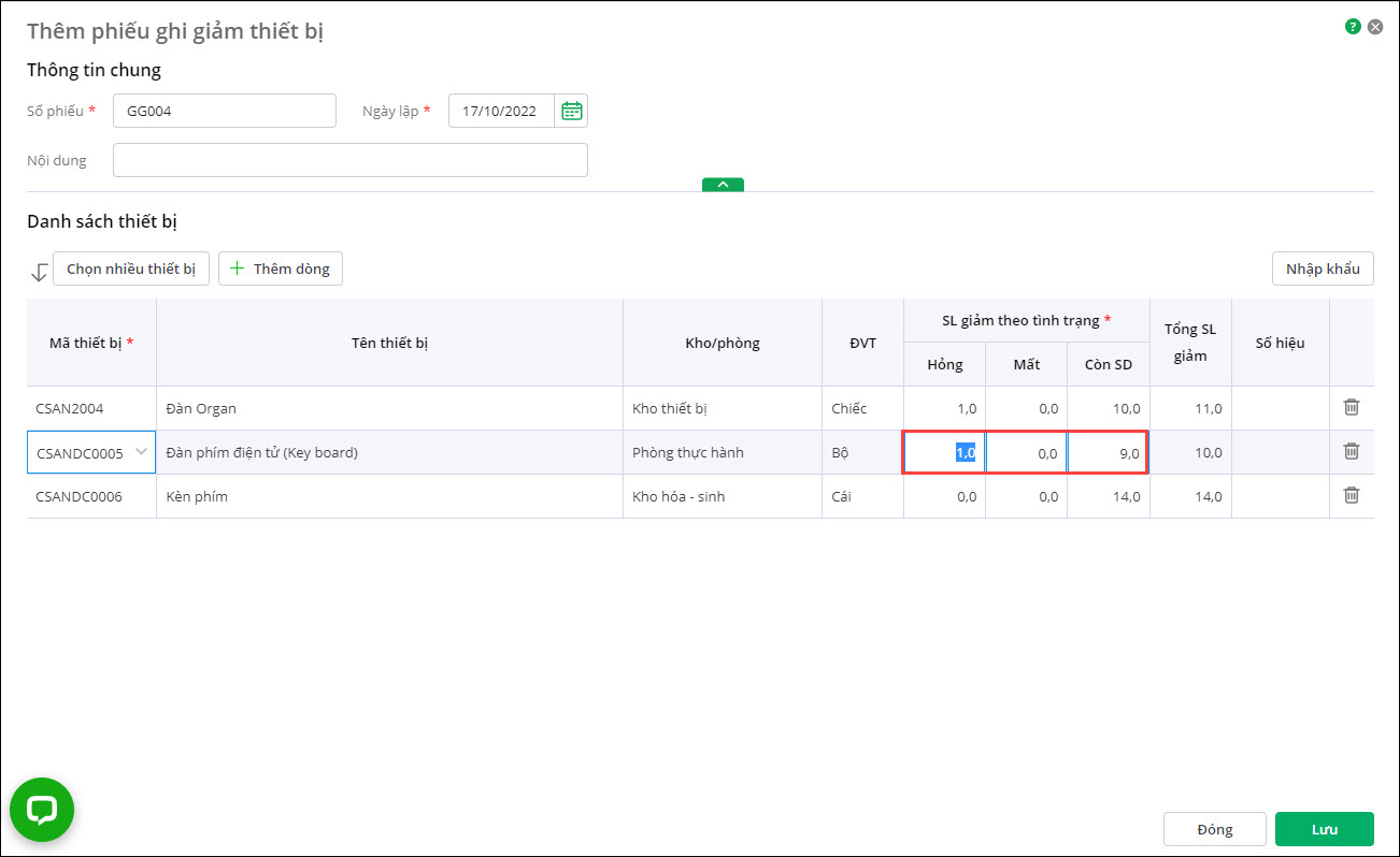 - Khai báo thông tin trên phiếu ghi giảm thiết bị: Số phiếu, ngày lập, nội dung.