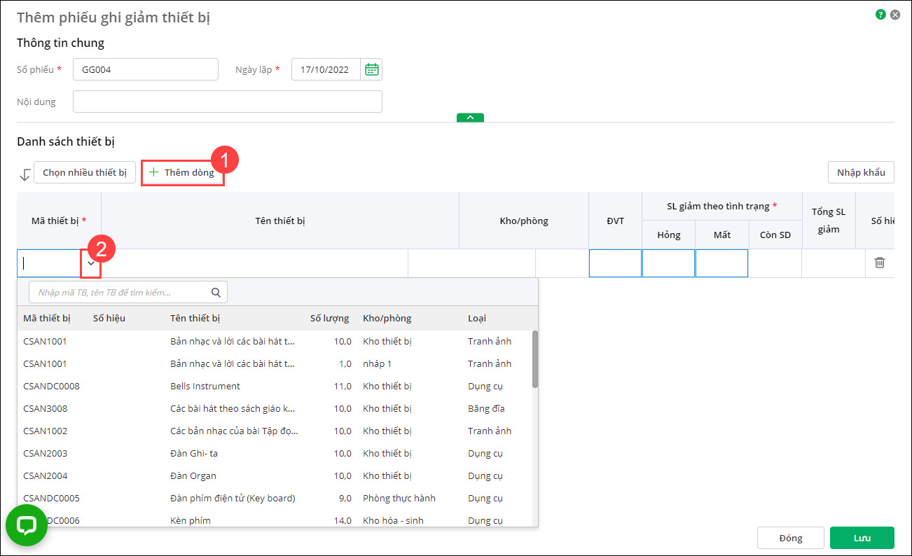 - Nhấn vào dấu mũi tên để chọn thiết bị cần ghi giảm trong danh sách thiết bị đã khai báo tại Danh mục thiết bị. Nhập mã TB hoặc tên TB để tìm kiếm nhanh thiết bị cần nhập.