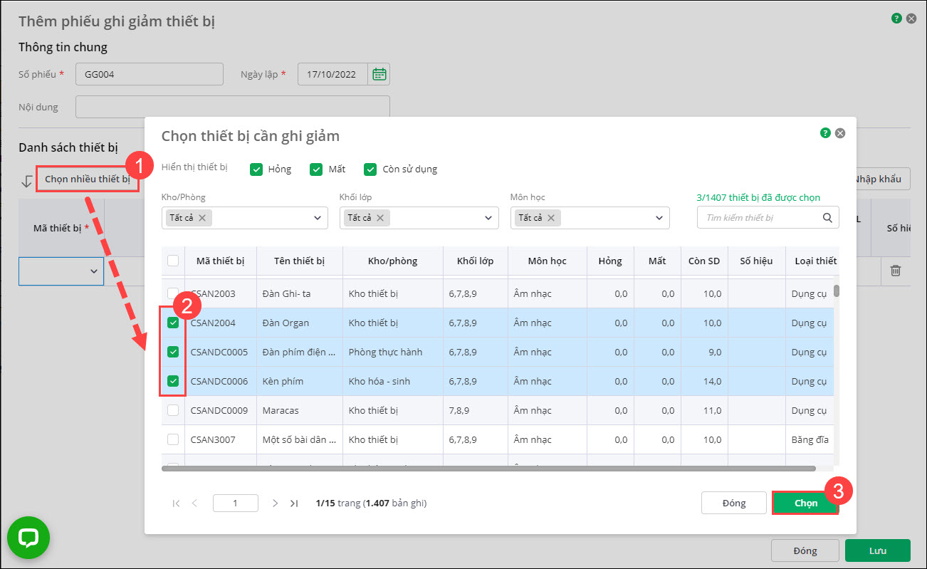 - Tích chọn trạng thái thiết bị muốn hiển thị để dễ dàng tìm kiếm: Hỏng, mất, còn sử dụng.
