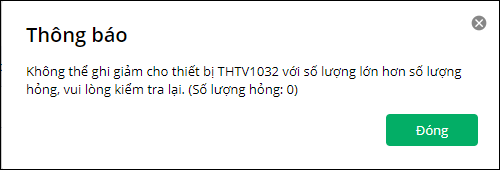 - Số lượng thiết bị ghi giảm phải nhỏ hơn hoặc bằng số lượng thiết bị trong kho. Trường hợp anh/chị ghi số lượng thiết bị giảm lớn hơn số lượng thiết bị trong kho, phần mềm hiển thị thông báo:
