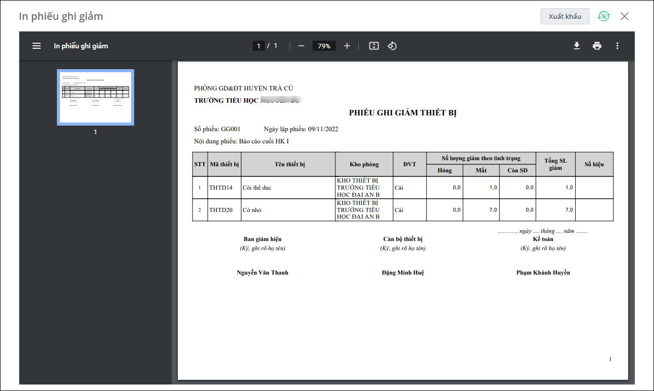 - Phần mềm trả ra phiếu ghi giảm thiết bị tại đơn vị. Anh/chị có thể in hoặc tải về máy với nhiều định dạng (PDF, Excel, Word,..)