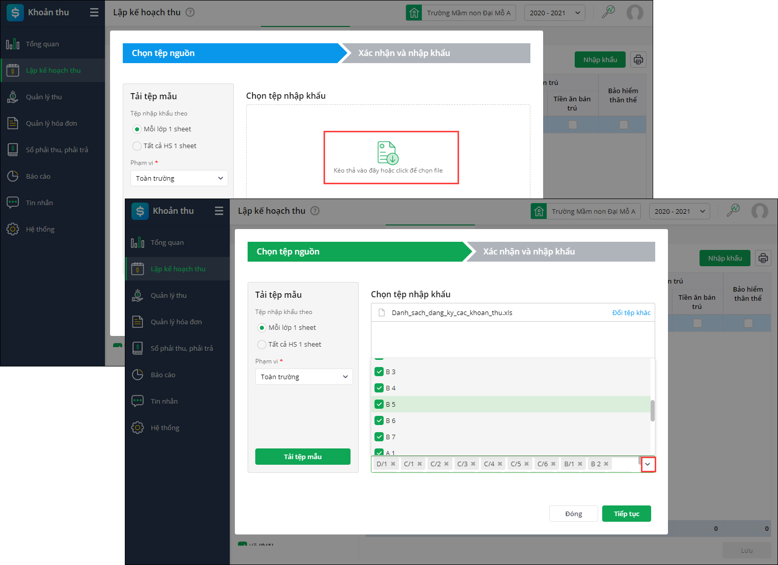 Lưu ý: Trong phiên bản R104 đang đáp ứng nhập khẩu dữ liệu từ file excel cho từng lớp hoặc theo toàn trường khi thực hiện nhập khẩu đăng ký khoản thu và nhập khẩu đợt thu.