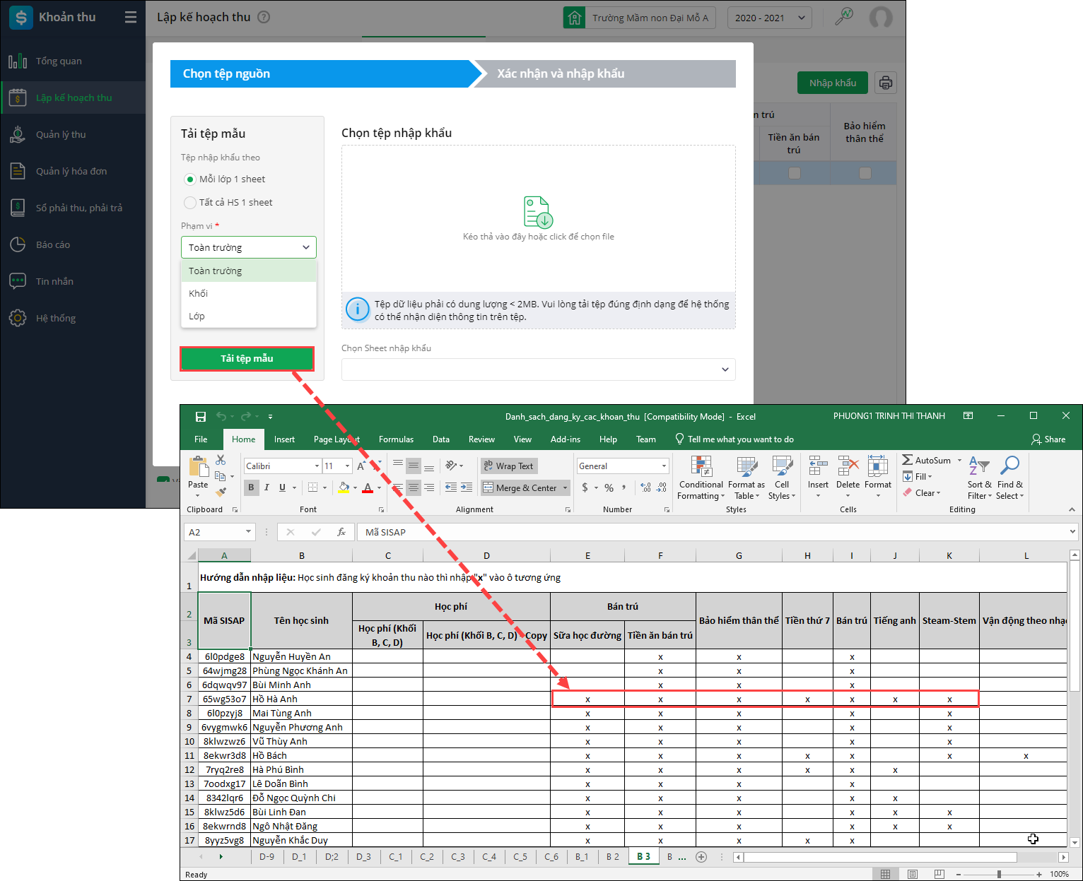 - Mỗi lớp 1 sheet hoặc Tất cả HS 1 sheet tùy thuộc vào tệp excel của đơn vị