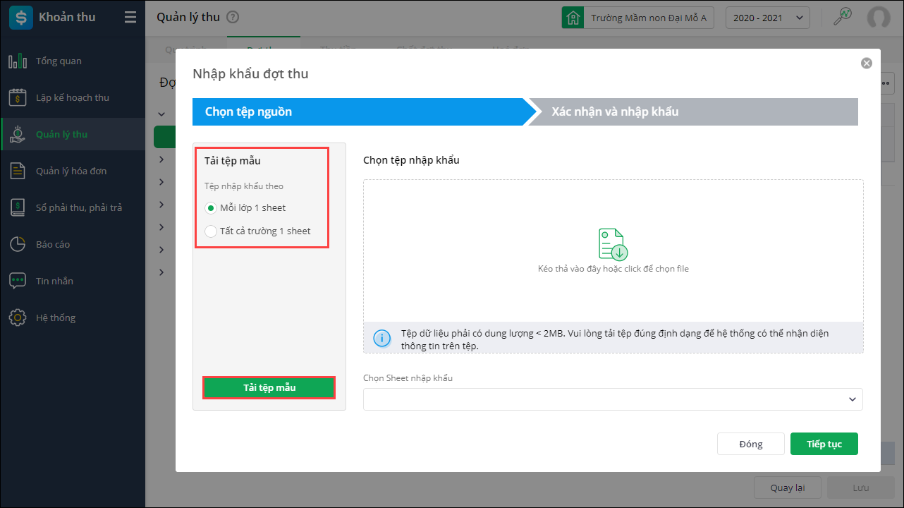 Lưu ý: Trong phiên bản R104 đang đáp ứng nhập khẩu dữ liệu từ file excel cho từng lớp hoặc theo toàn trường khi thực hiện nhập khẩu đăng ký khoản thu và nhập khẩu đợt thu.
