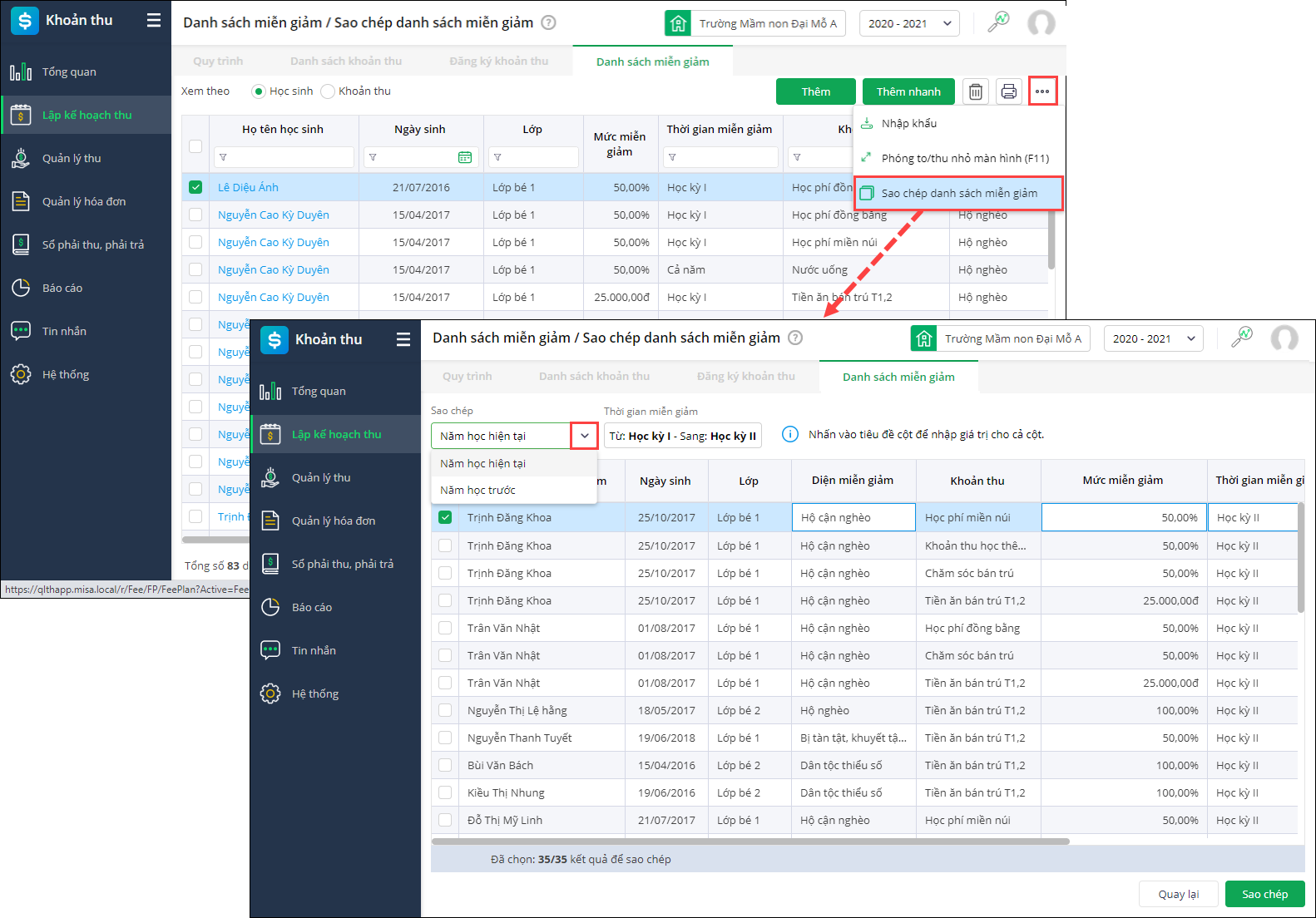 - Từ phiên bản R104: Bổ sung tính năng Sao chép danh sách miễn giảm năm học hiện tại để sao chép danh sách học sinh được miễn giảm học kỳ I sang học kỳ II để tiết kiệm thời gian thao tác.