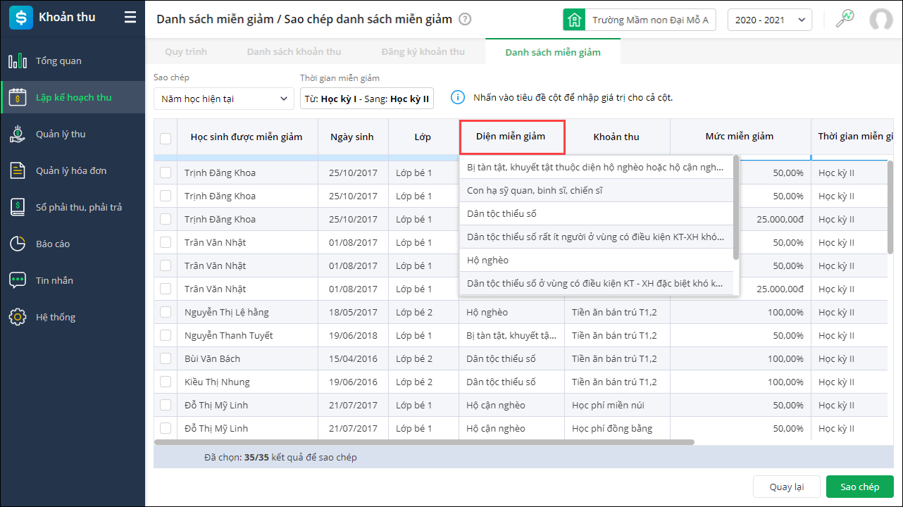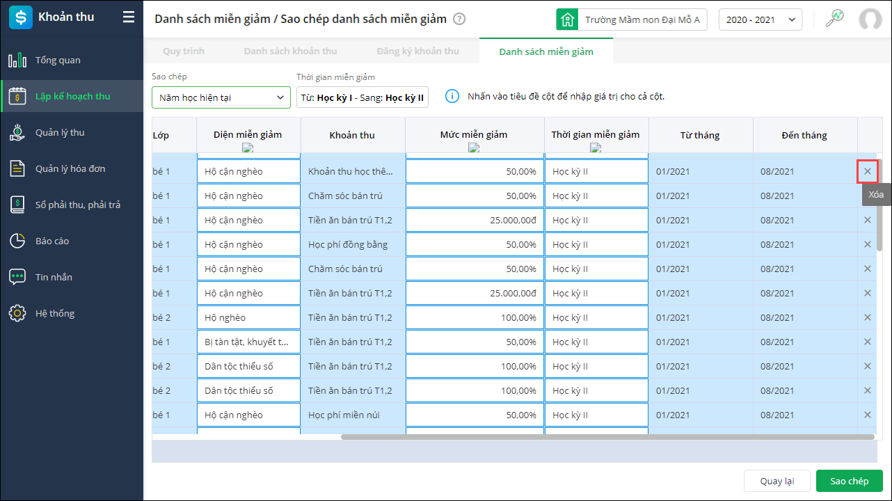 - Trường hợp có học sinh không cần sao chép thông tin miễn giảm, anh/chị nhấn vào biểu tượng “dấu nhân” để xóa học sinh đó khỏi danh sách sao chép.