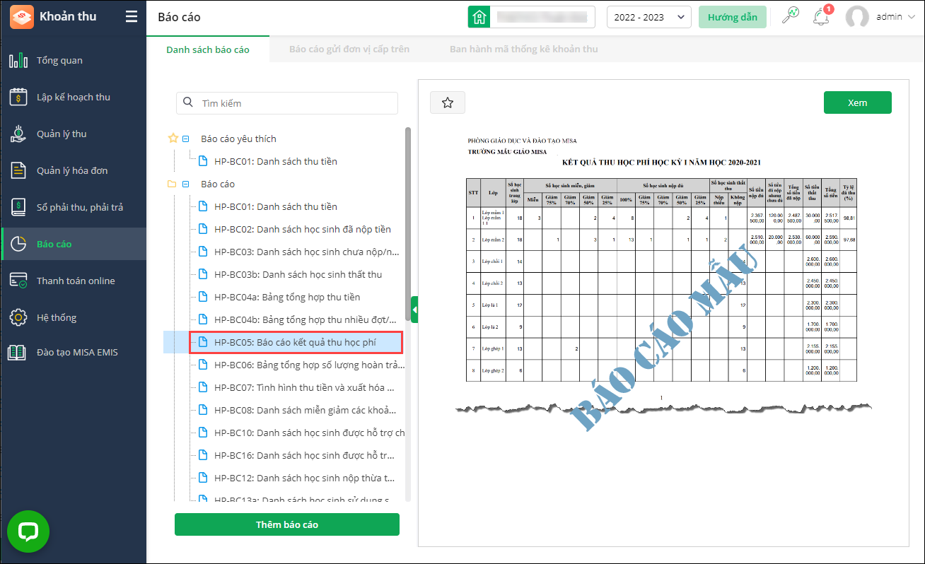 - Vào Báo cáo\Danh sách báo cáo, chọn Báo cáo\HP-BC05: Báo cáo kết quả thu học phí.