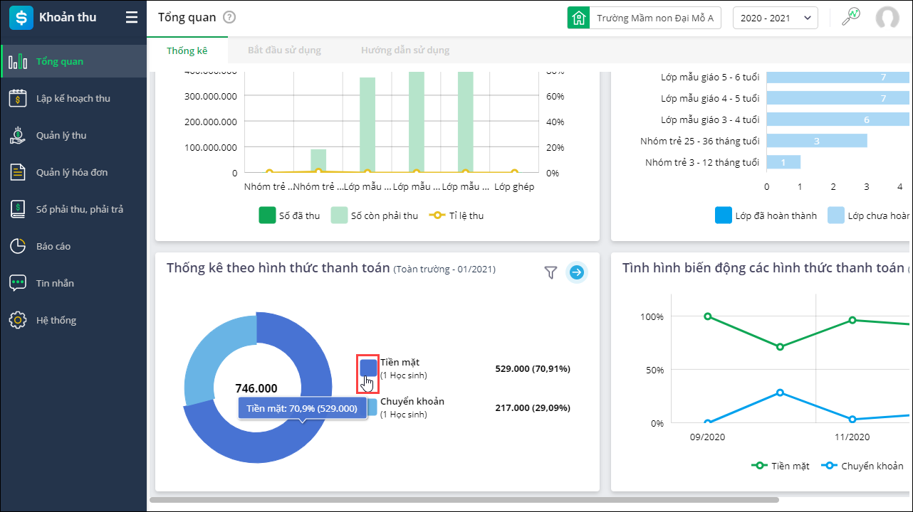 - Khi di chuột đến hình thức thanh toán nào, phần mềm hiển thị thông tin: Số học sinh, Số tiền, Tỷ lệ phần trăm sử dụng hình thức thanh toán đó.