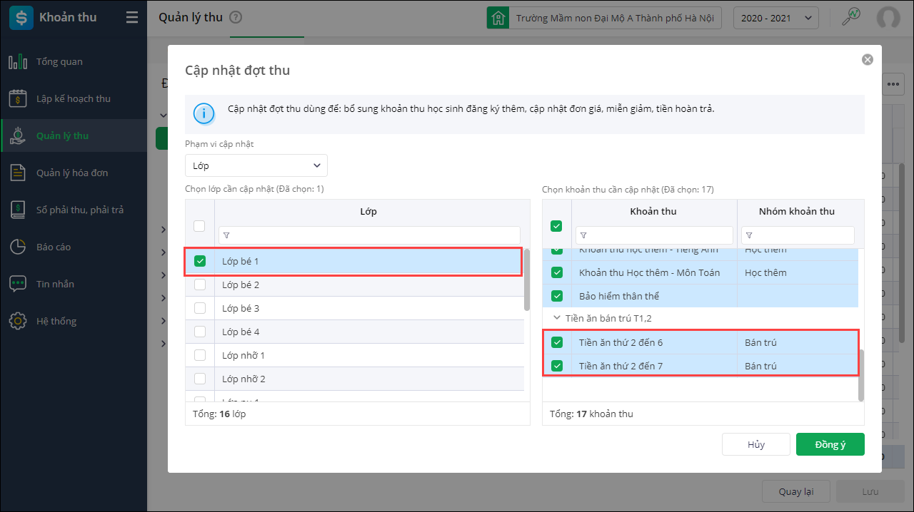 - Chọn phạm vi cần cập nhât là Khối/Lớp/Học sinh, tích chọn Khối/Lớp/Học sinh ở dãy cột bên trái và khoản thu cần cập nhật: Tiền ăn thứ 2 đến 6, Tiền ăn thứ 2 đến 7 ở các cột bên phải tương ứng.