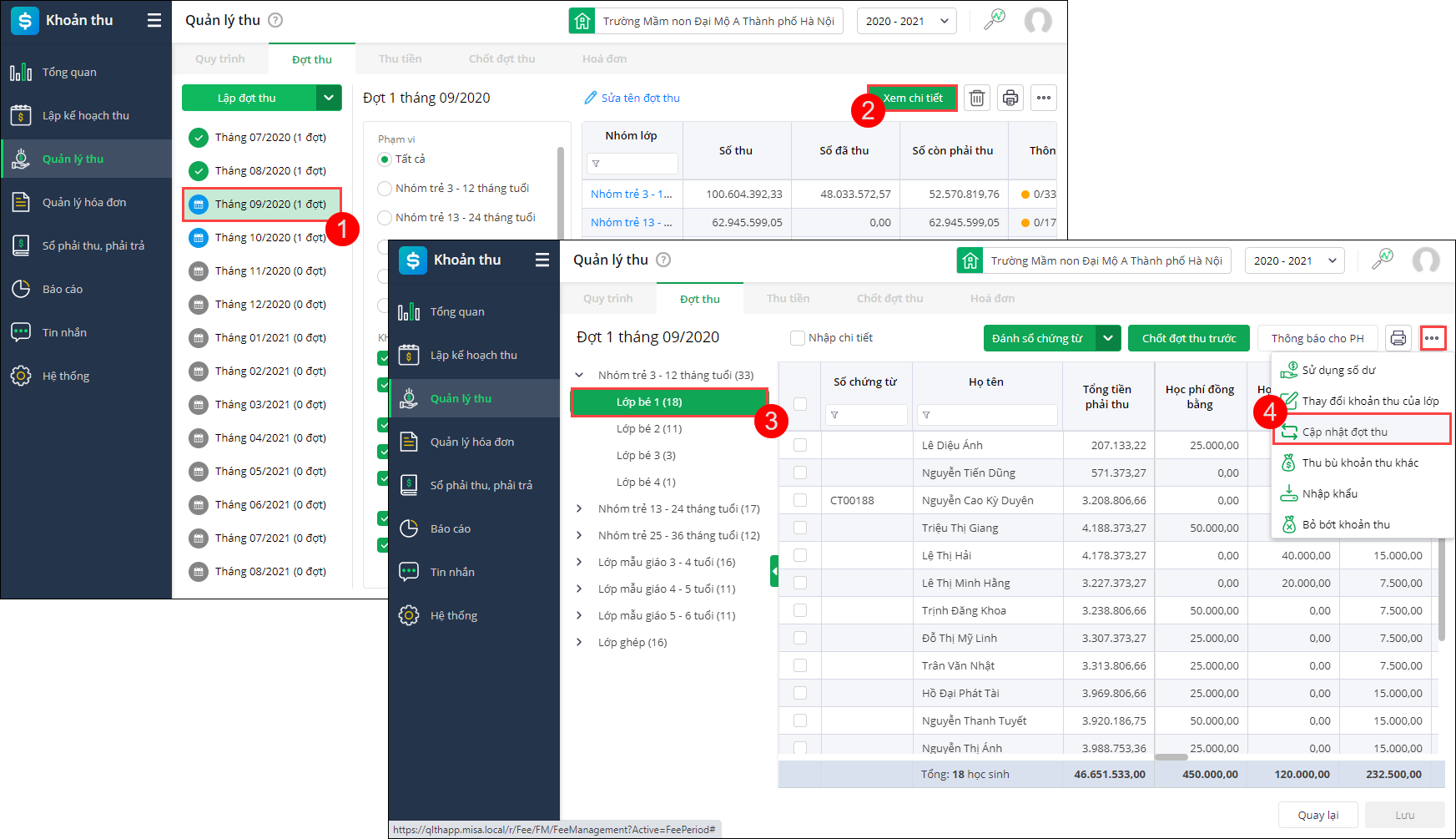 - Chọn lớp cần cập nhật lại, nhấn biểu tượng “tiện ích”, chọn Cập nhật đợt thu