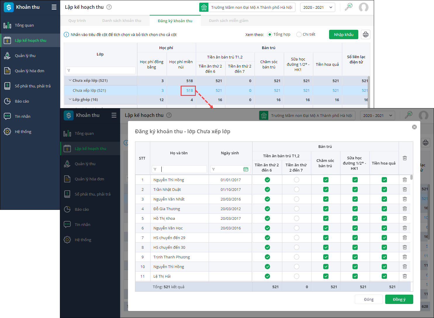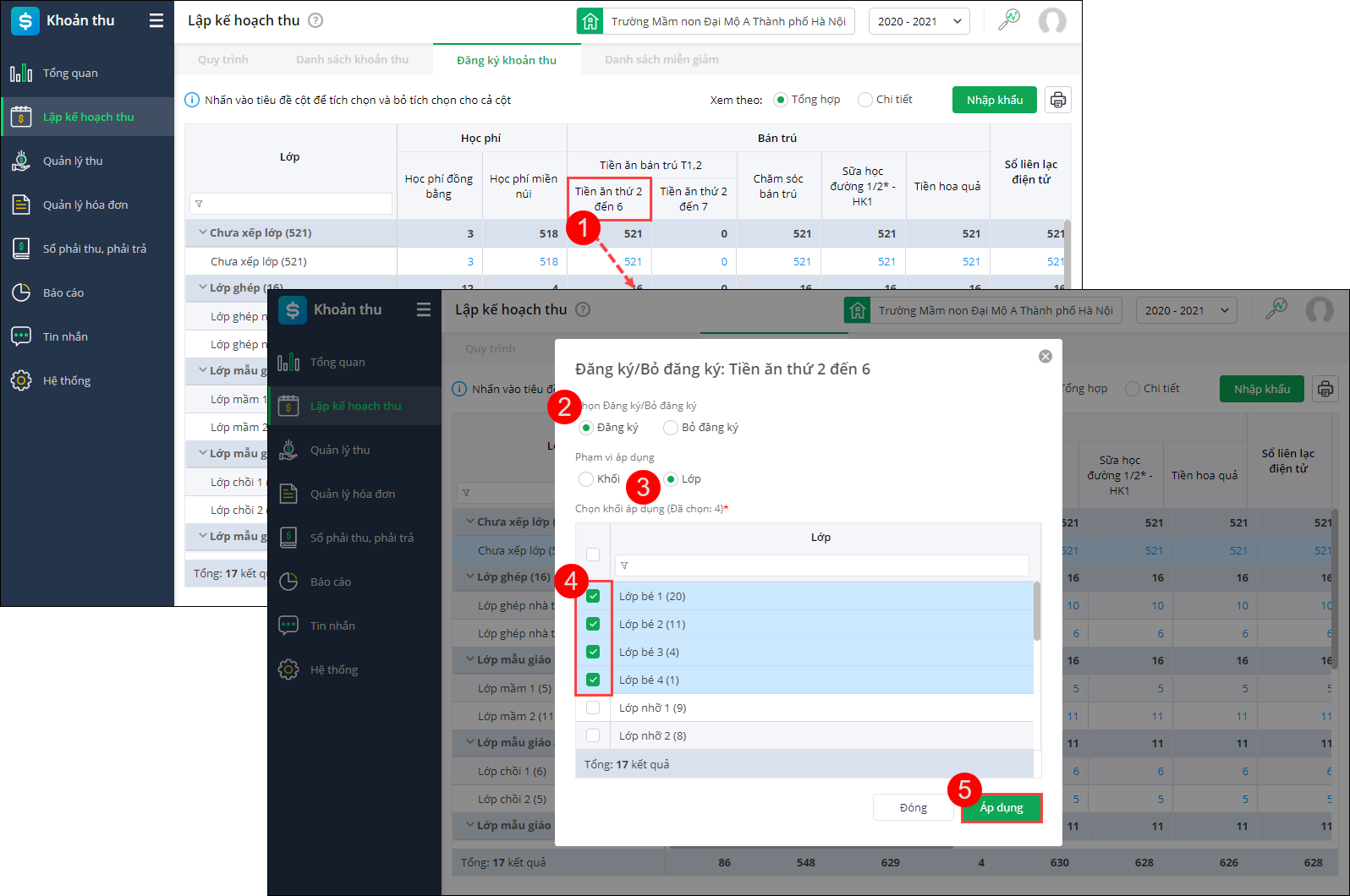 - Trường hợp theo phạm vi anh/chị chọn (Toàn trường, khối, lớp), các học sinh đăng ký những khoản thu giống nhau, anh/chị thực hiện đăng ký nhanh trên màn hình tổng hợp.
